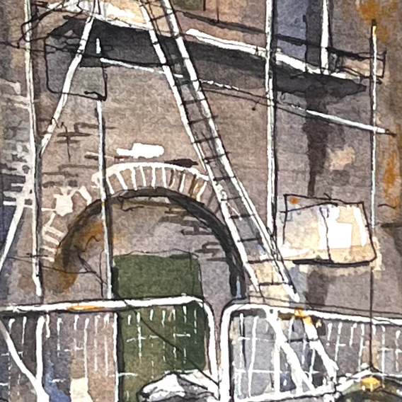 I sketched the house on a very cold day in January. There was a strong wind which not only threatened to throw my sketchbook into the Cam, but also made my eyes water so I couldn’t see properly. I finished the pen and ink, and decided that was enough. Then, by a happy chance, I encountered the current owner unlocking the fence gate. Hence I learned about the efforts of this mother and daughter team, who are determinedly navigating the difficulties of an old building, listed consents, and many other obstacles. But they make amazing progress! See their instagram account for more information.