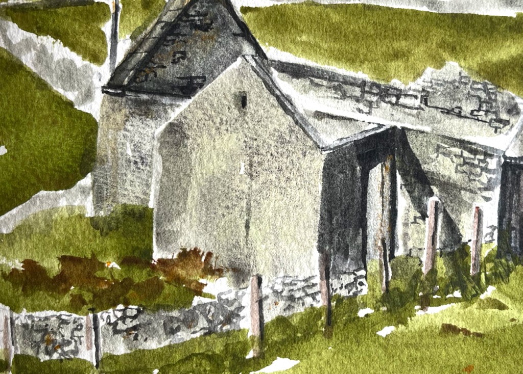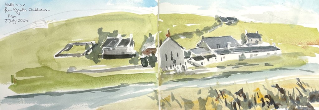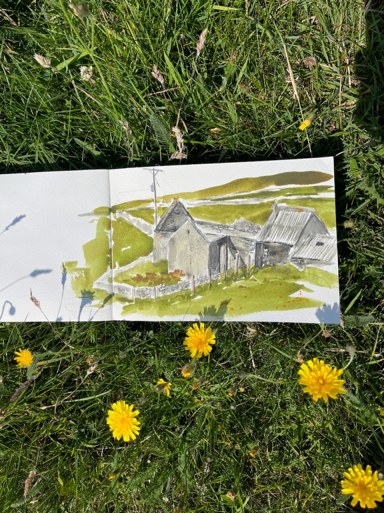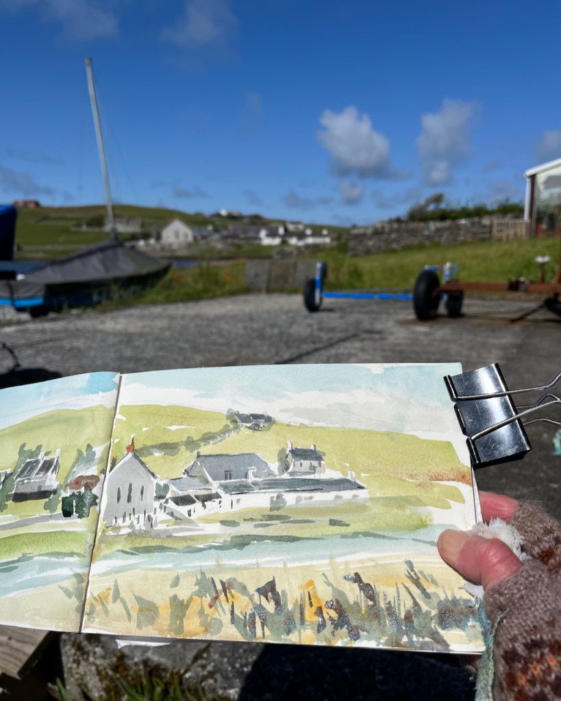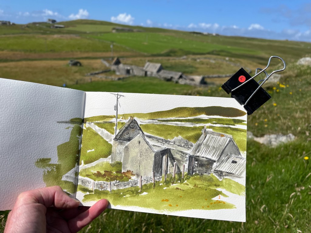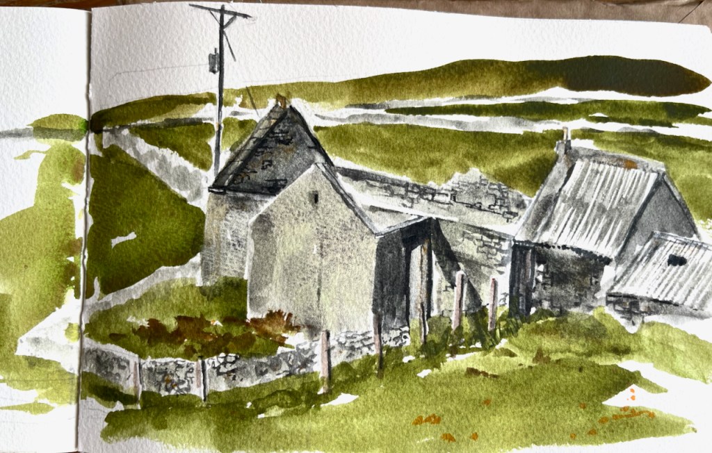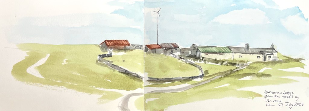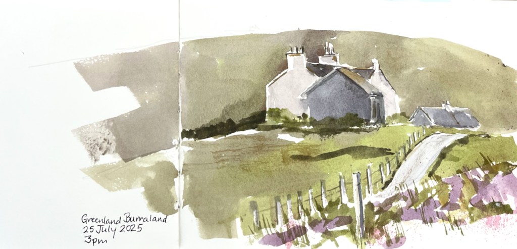 Houses at Greenland Burraland, Shetland West side. July 2025Sketching by the side of the road. The houses I am sketching are in the centre distance.