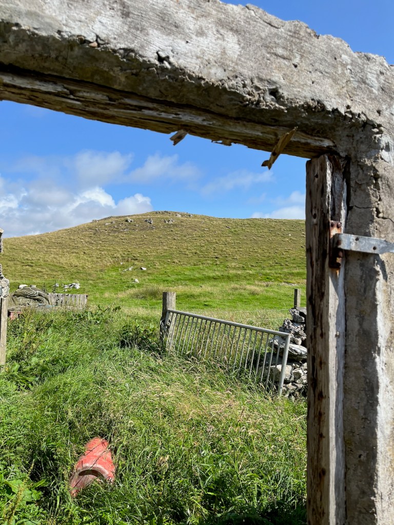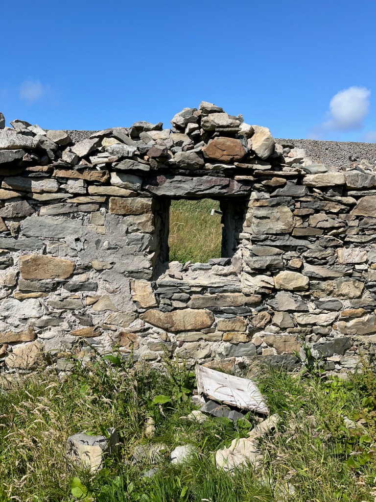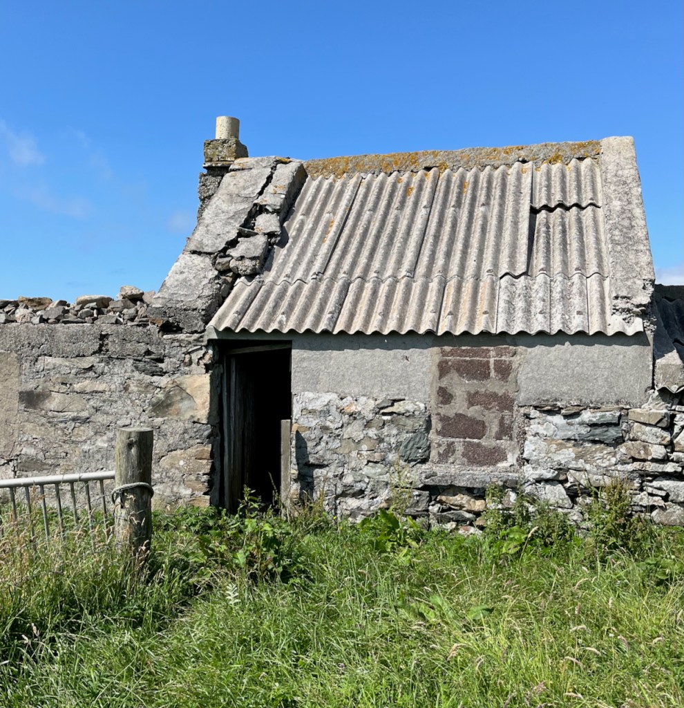 Some of the croft houses are abandoned, and starting to fall down. Here is a ruined croft house near the standing stone at Vesquoy, Shetland West side.