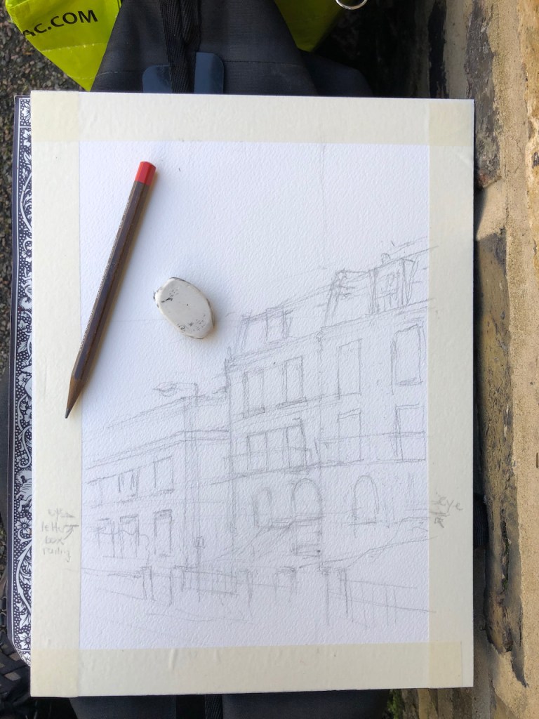 I made some preliminary drawings a few days previously, to get my head around the composition and the perspective challenges.