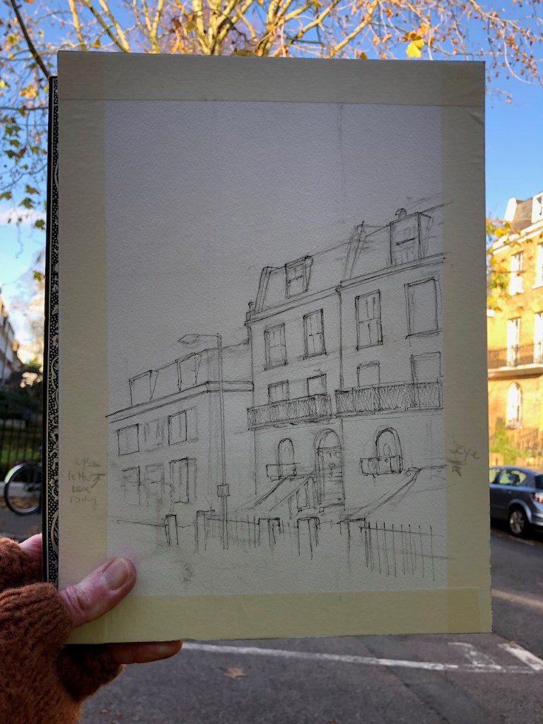 Grove Lane, Camberwell. 12″ x 9″ watercolour on Arches paper. Drawn on location, 5th December 2020.
