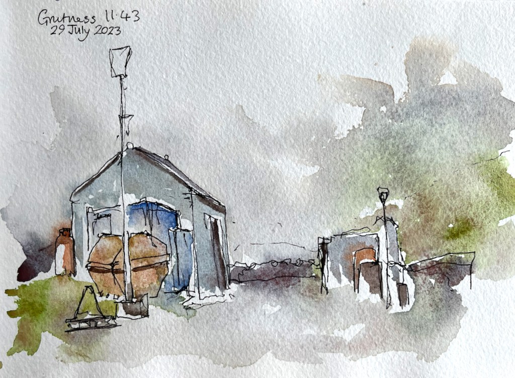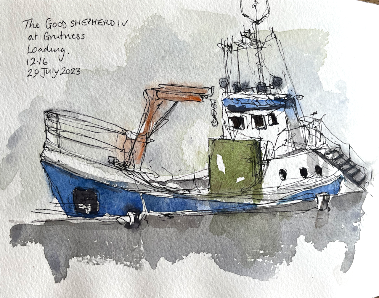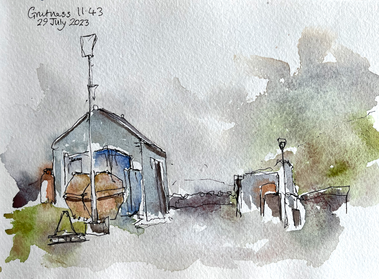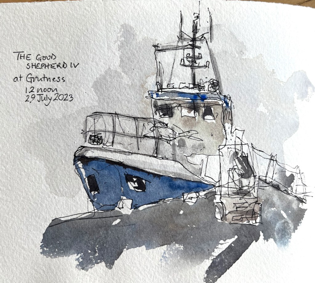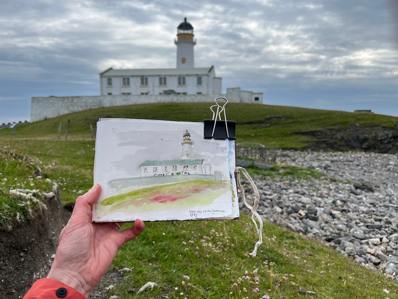 I was staying at “The Auld Haa” which is just a few hundred yards from the lighthouse. When I returned from drawing this scene, Tommy, who runs the guest house, called out, “Come and choose a fish!”. There was me and two other women staying at the guest house at that point. Bemused, we all made our way round the side of the house to find a cheerful fisherman standing by his car trailer on the small road. The trailer was laden with fish. The fish were in buckets. There were cod about two feet long, and mackerel, and a whole bucket of lobsters. The fisherman was Stephen, who I recognised as one of the ferry crew.