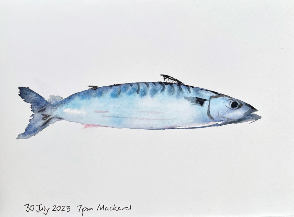 Yes, I would like to do a painting of the mackerel, even though I was tired, even though it was evening, even though I’d already done a long walk, a dip in a rockpool, and several paintings of headlands. How often do you get invited to paint a mackerel? Seize the moment. Tommy brought out the mackerel on a plate, and I settled down to drew, while the hens scraped around on the grass, and small birds scuttled in the hedge.