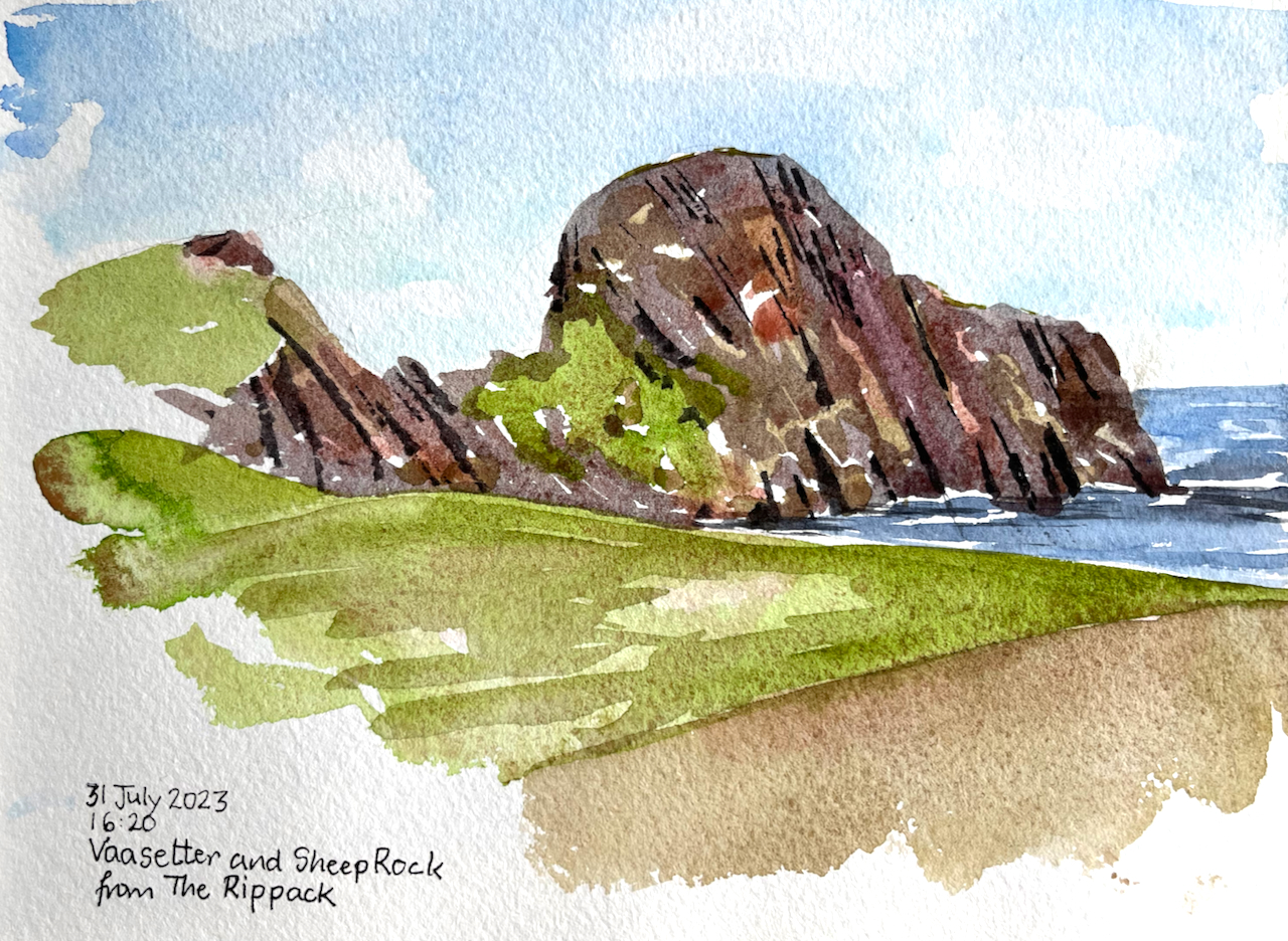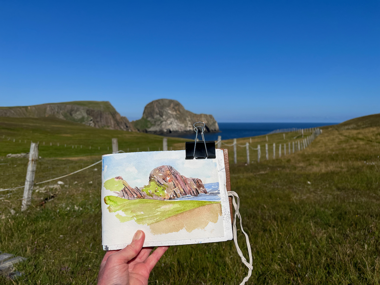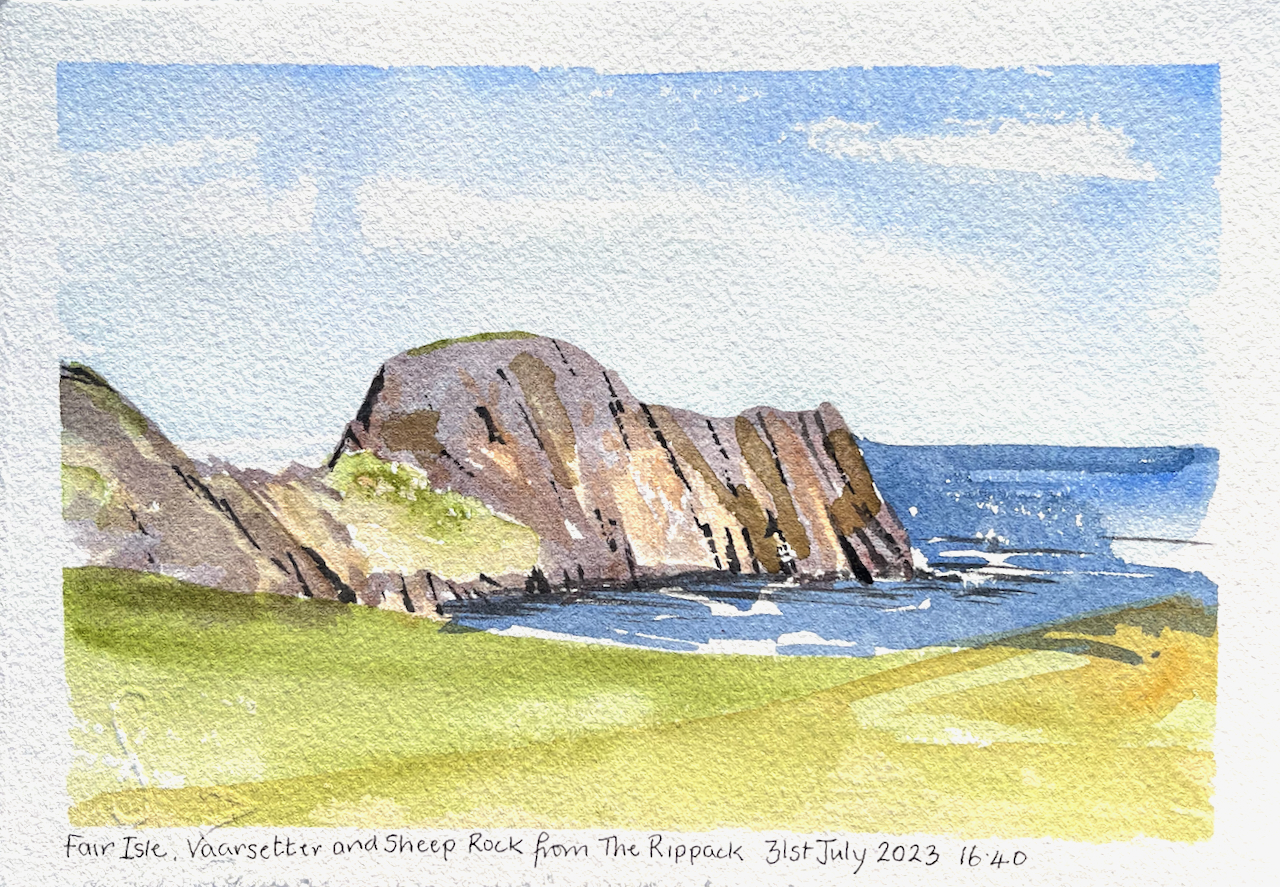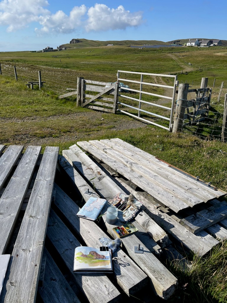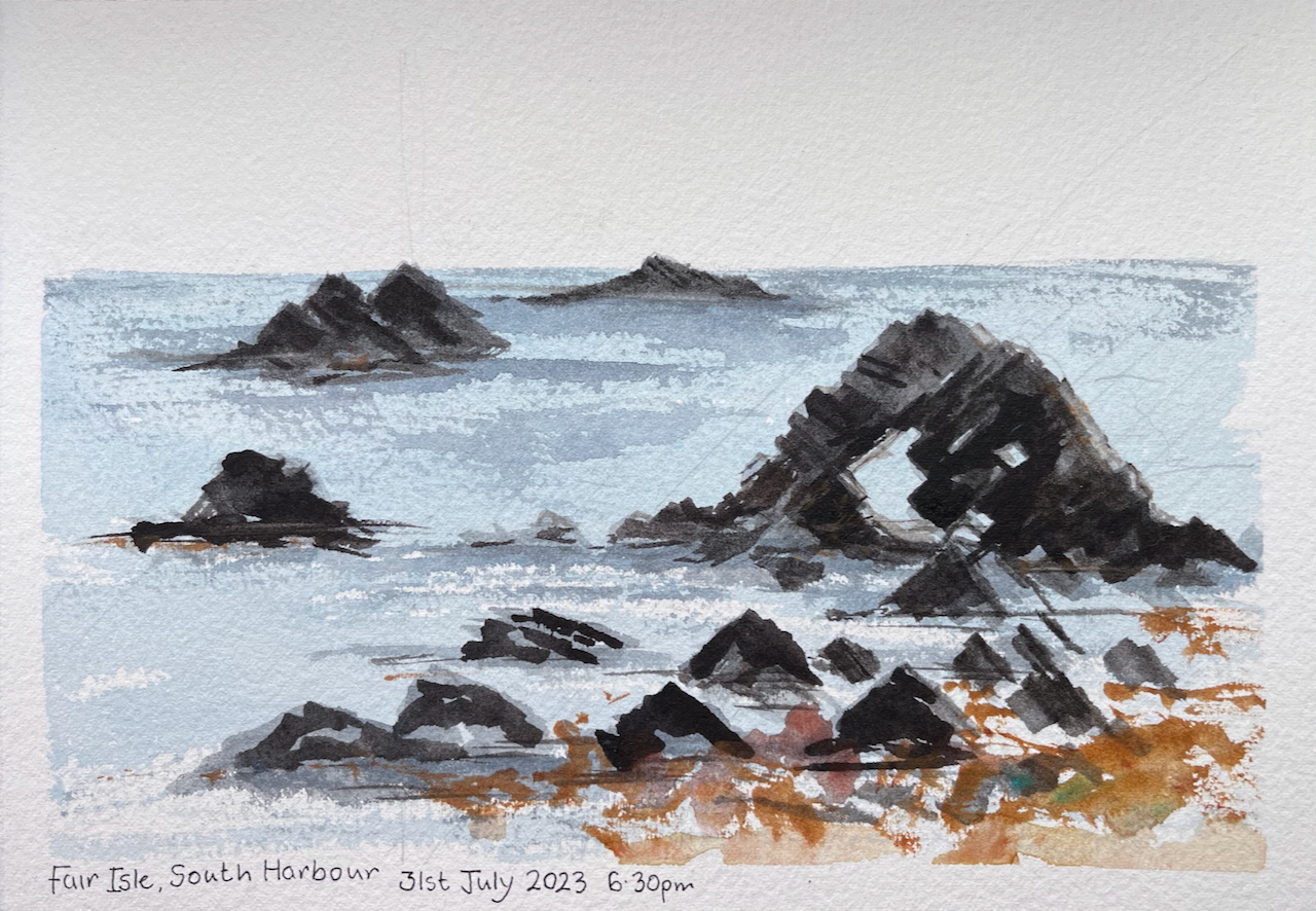 I had to sketch this in a bit of a rush, because, as I rapidly discovered, this particular area is the province of the Skua. There are Great Skua and Artic Skua: large birds, who do not like sketchers sitting on stones in their neighbourhood. They make their irritation known by aggressive fly-pasts. I could hear the wind in their feathers: it sounded like a chain saw. So I quickly took the hint and made for the road. Locals later told me I should “carry a stick above my head”, to distract the skua. That’s all very well, but finding a stick on Foula is about as likely as finding a branch of Pret. There are no trees atall on this part of the island, so no handy lengths of wood.