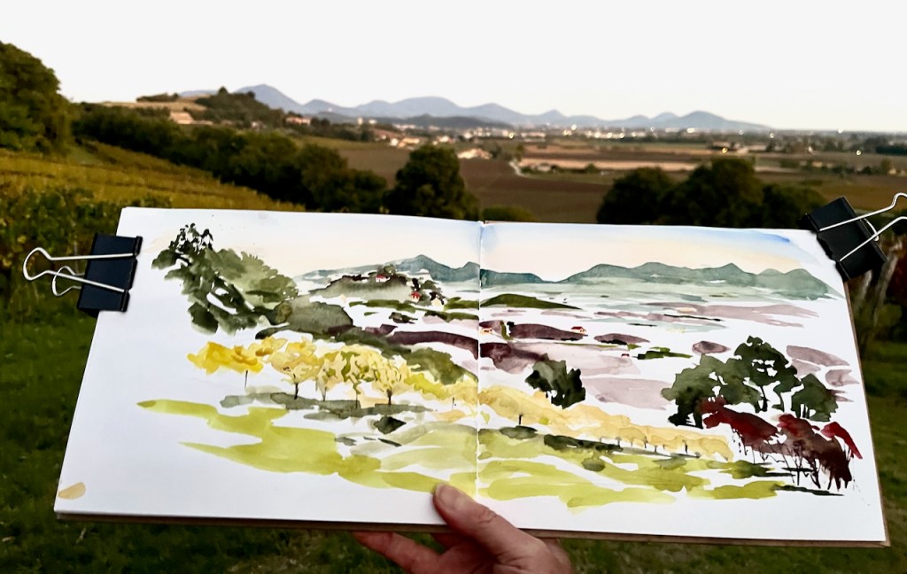 I took an A5 sketchbook from JP Purcell, and sometimes sketched the landscape view across two pages: