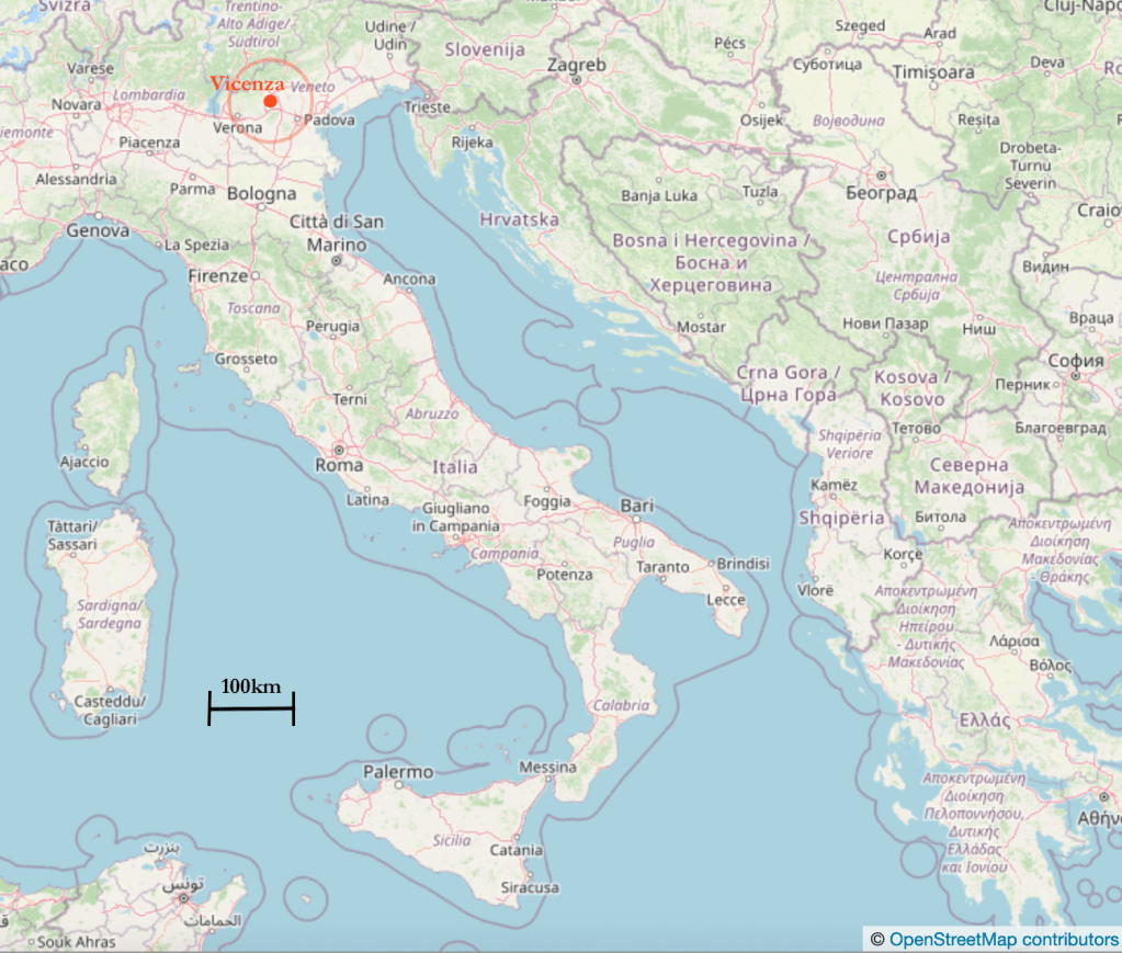 Location of Vicenza, in Northern Italy. Map (c) OpenStreetMap contributors