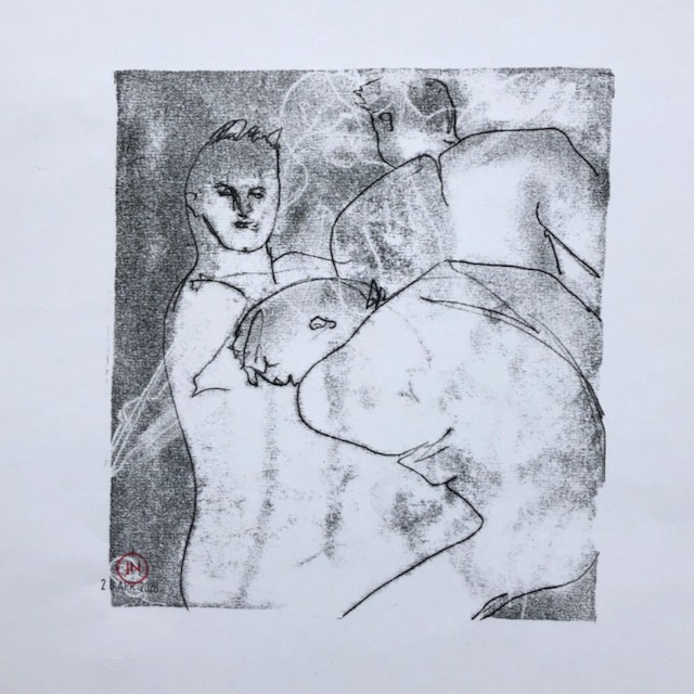 These pictures are monoprints, made by drawing or pressing on the paper which is placed on top of an inky sheet. What you see is the reverse of the sketch. The places where I pressed took up the ink. It’s like drawing or pressing on top of carbon paper, if you remember carbon paper. I like the technique because I can’t see what I’m drawing, so the lines tend to be more free, and I worry less about “getting it right”. The dark patches are made by pressing in the paper with fingers or an object, so it’s possible to get very dark tones quickly, which I like. It’s also a bit unpredictable, at least for a beginner like me, I have, so that the picture is a bit of a surprise. It helps that the picture is a mirror image, so when it appears, it’s different from what I drew.