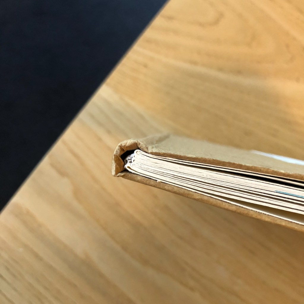 Here is the book under construction. The binding was made from the stiff cardboard from the back of drawing pads, strengthened at the spine with scrim, and covered in brown paper. In the absence of a bookbinding press I used two 12kg weights, and the breadboard. There were 32 useable sides (16 leaves), 4 signatures of 2 sheets and 1 signature of 1 sheet. The paper is Khadi smooth watercolour paper.