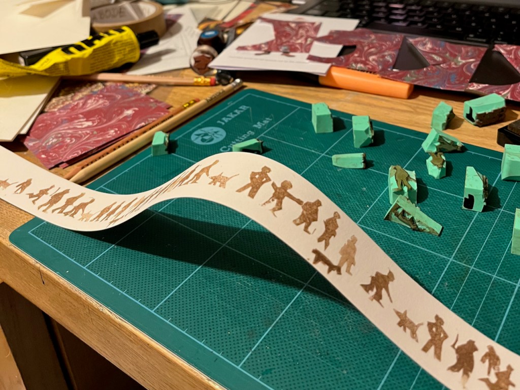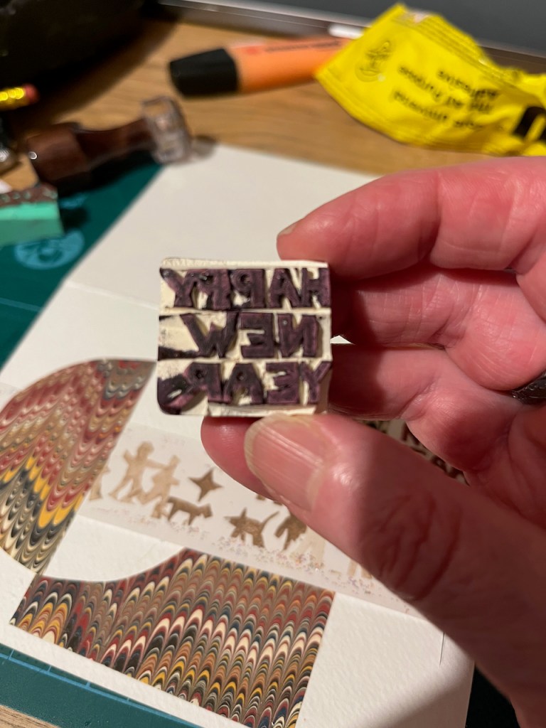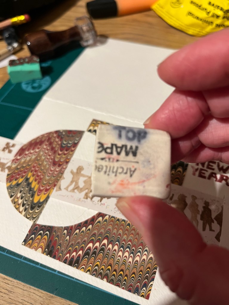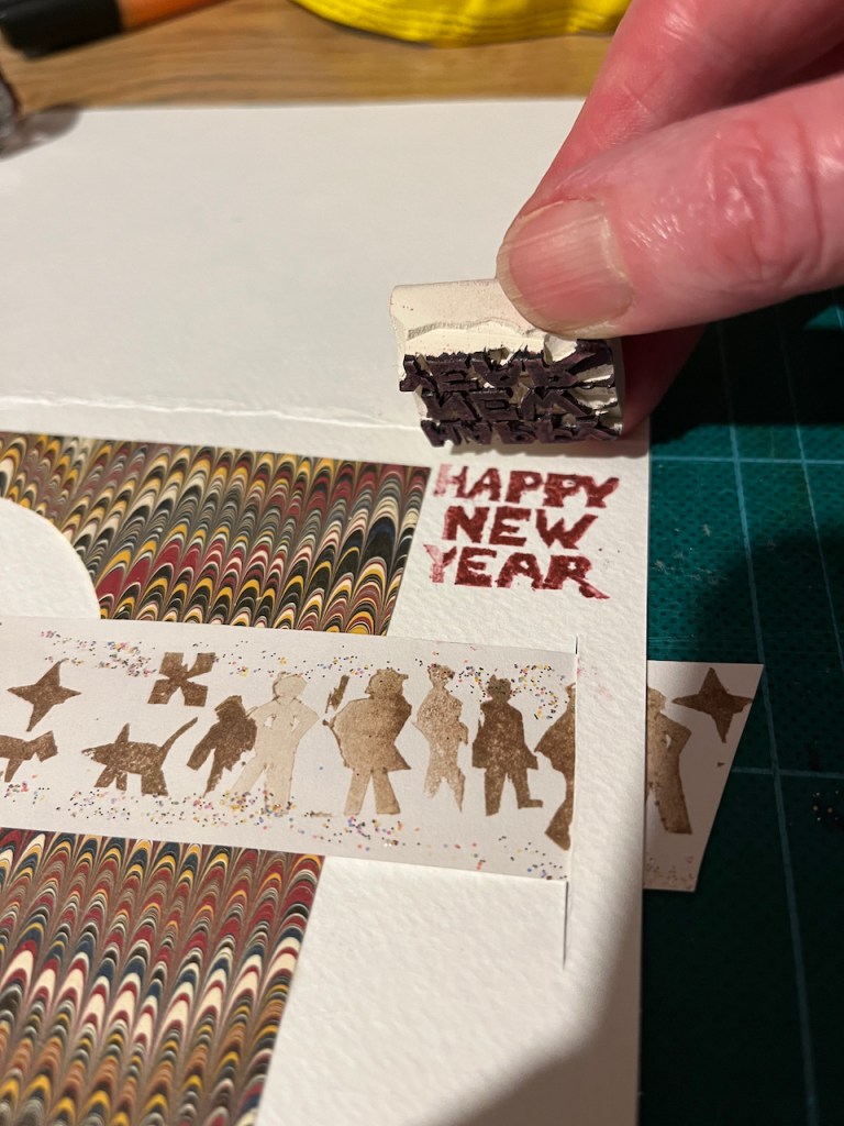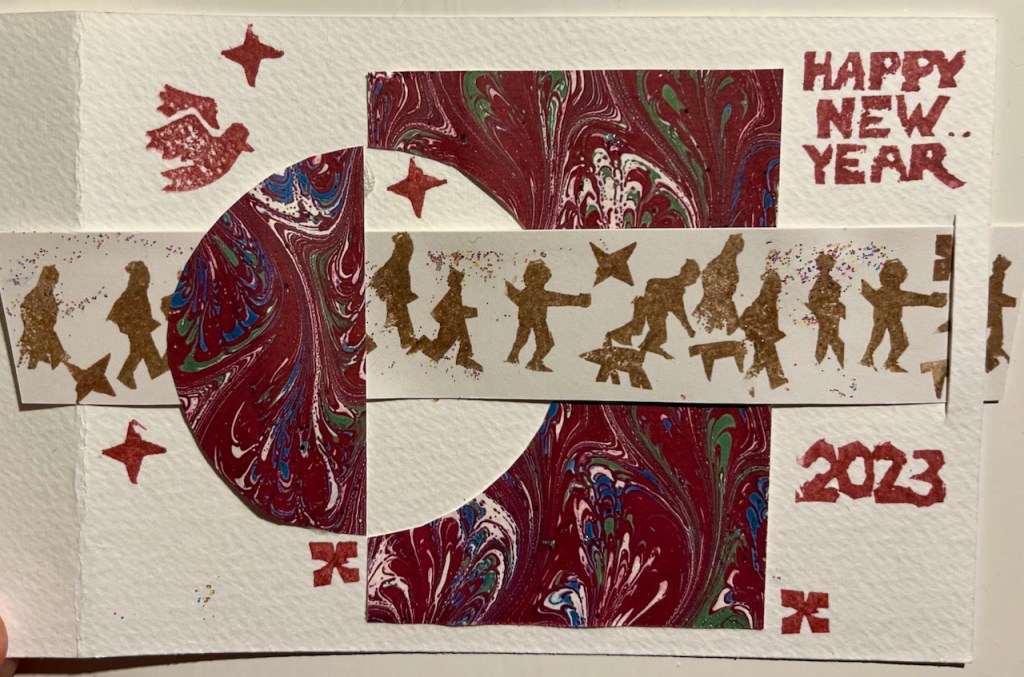 I make New Year cards most years to send to friends and family. In recent years they have been prints: woodcuts or linocuts. This year it was a collage. My card this year is made of marbled paper and a kinetic band of people. The people are printed from carved rubber stamps. The concept was to show “through it all together”: people going under and over and through.