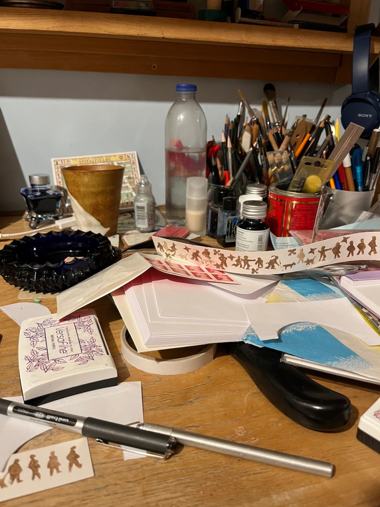 The marbled paper is from a pack of offcuts from the Wyvern Bindery. There are several different designs. The white card is watercolour paper from Jackson Art, cut down, with the offcuts used to make the moving band of people. I made about 45.