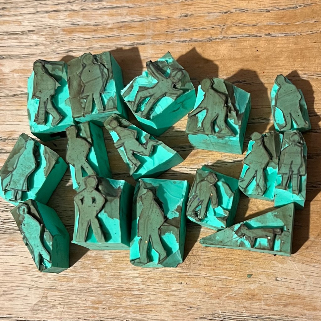 Here are the rubber stamps which made the people and the dogs. I cut them from a large pencil eraser.