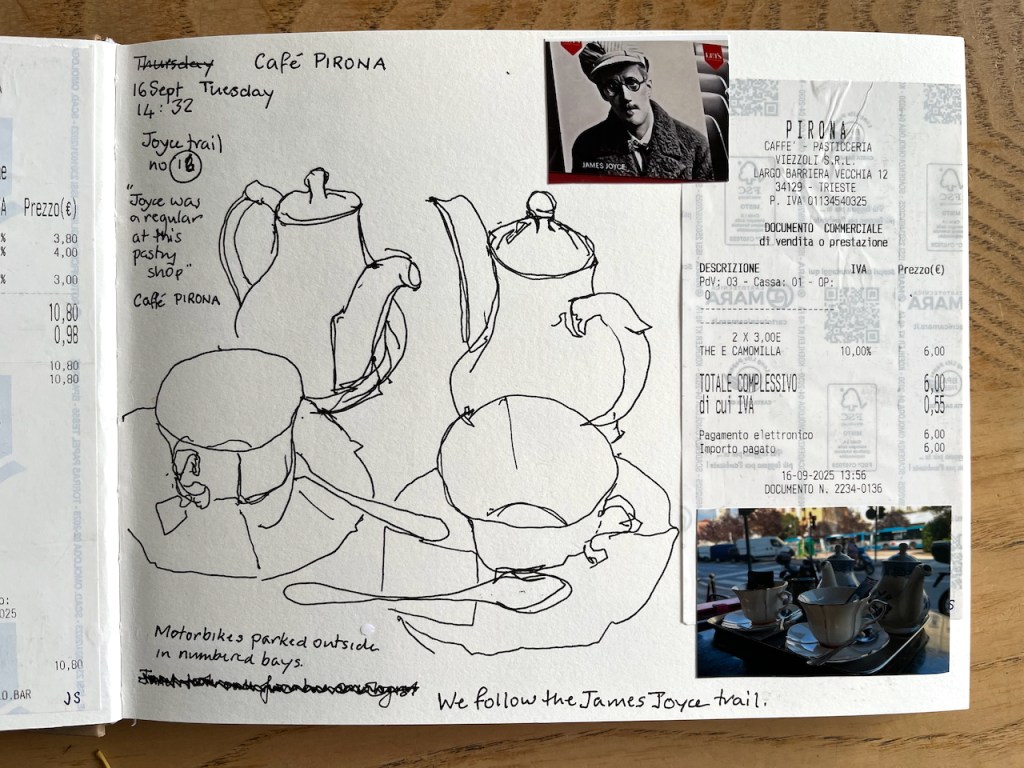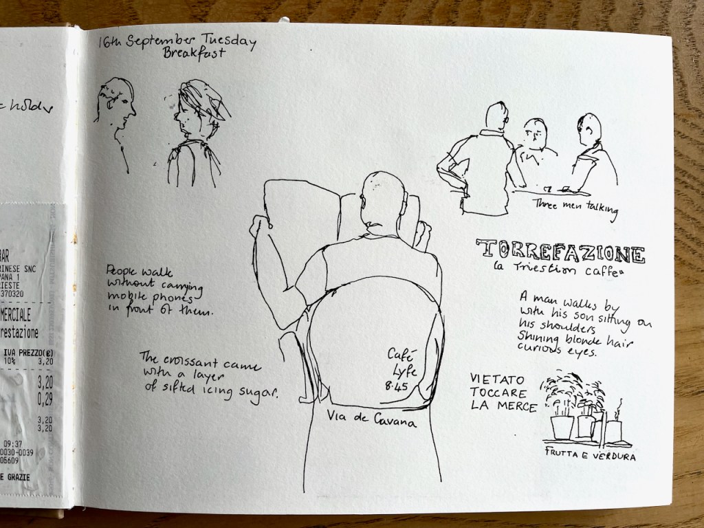 On board MV Hrossey, approaching Aberdeen. Breakfasters in the lounge. August 4th 2023. Vintage paper company sketchbook, A5