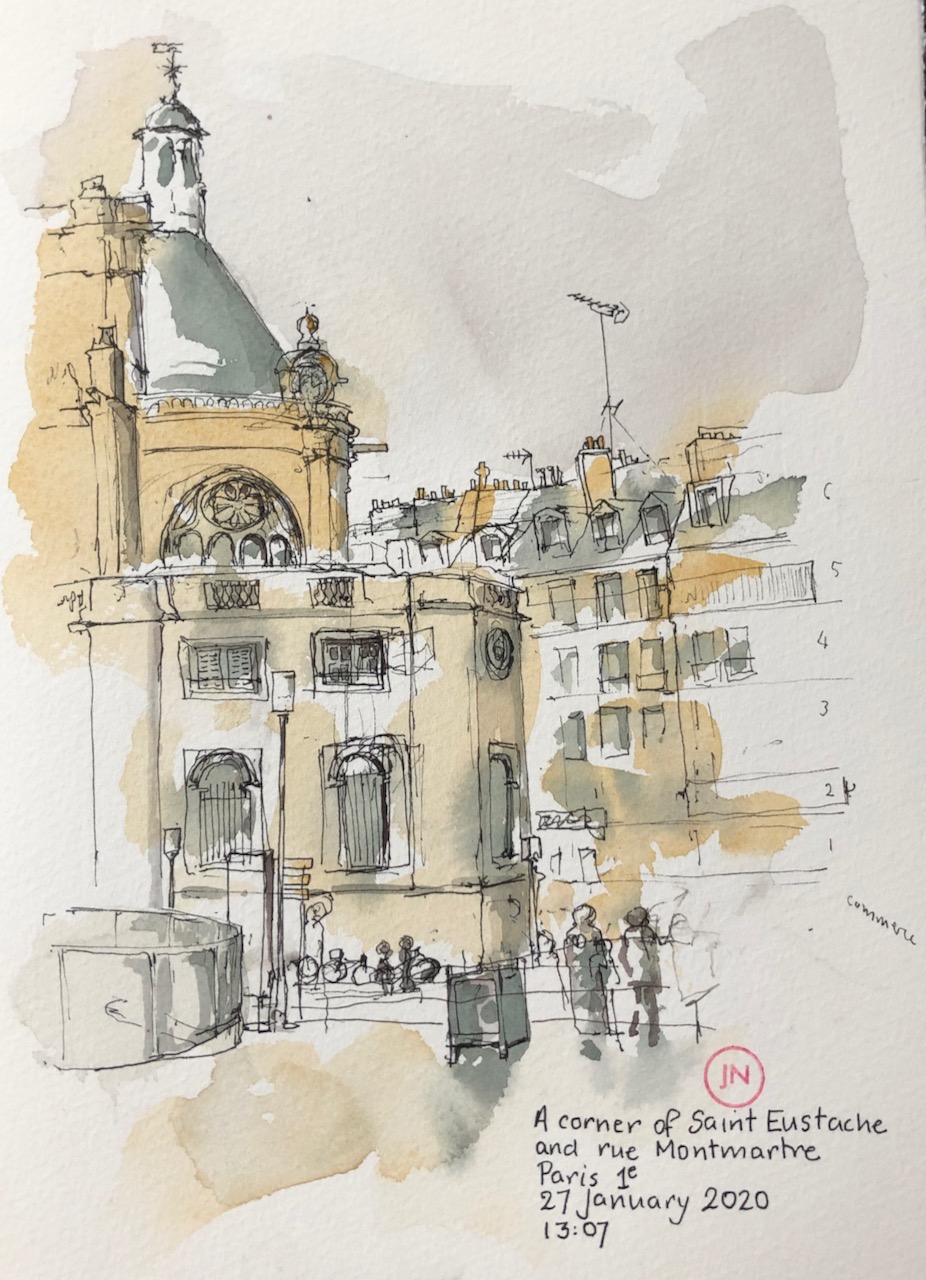 Here’s another sketch in the same area. This the “Bourse de Commerce”, the Commodities Exchange. It’s now the former Commodities Exchange, with massive building work going on to convert it into a contemporary art space. The architect for the conversion is Tadao Ando.