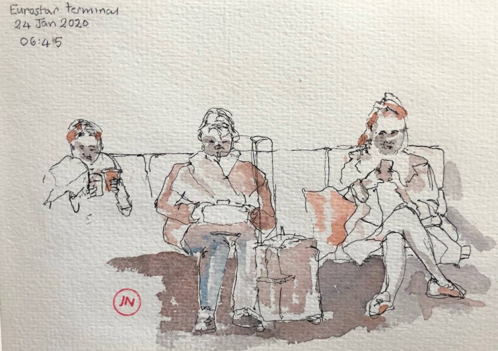I did some people-sketching in a café and in waiting areas on the trip. I am on a mission to get more people into my drawings, so I practice.