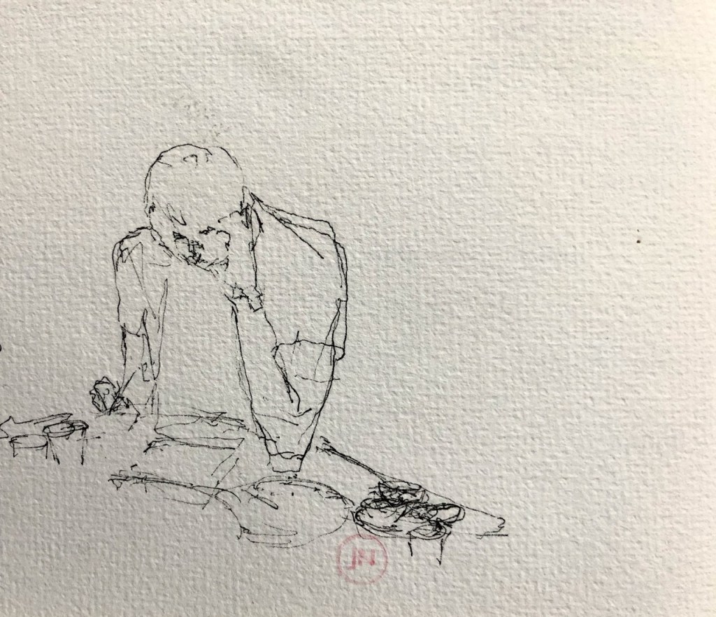 On the bench by the window, a man was completing the cross word, or engaged in some other puzzle that required his total concentration. This made him a good subject for a quick sketch.