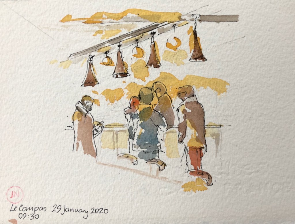 St Eustache was built between 1532 and 1632. I drew it standing in the pedestrian area near Les Halles, as people flowed by. I enjoyed the fact that there were huge chimneys on the church, shown high up on the left edge of the picture.
