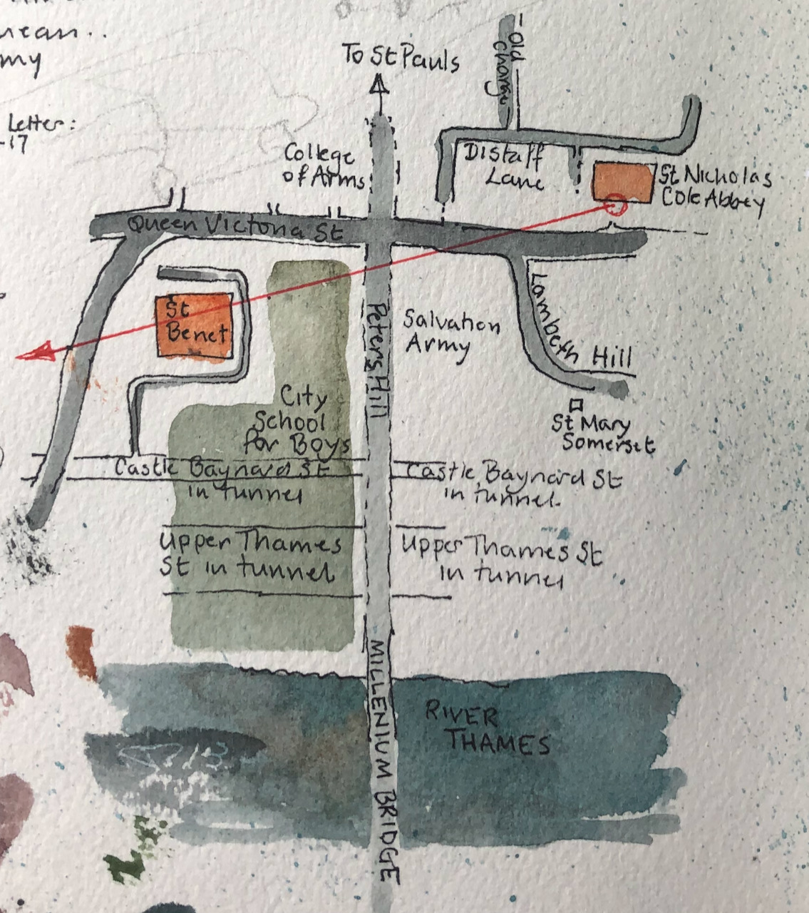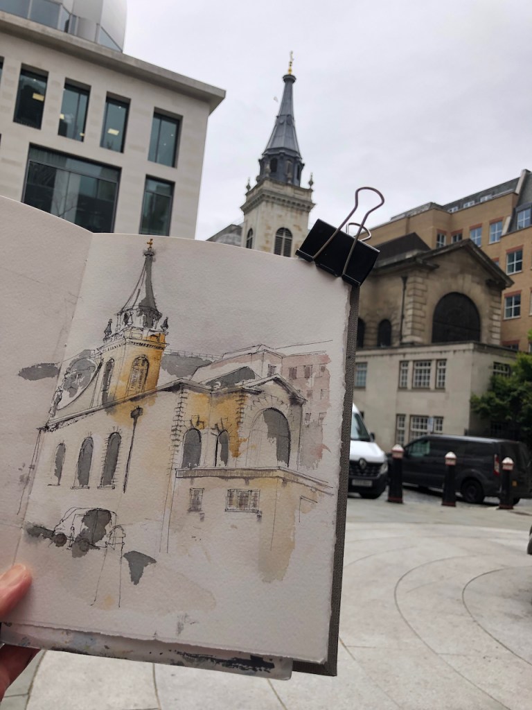 Guild Church of Saint Benets, from St Nicholas Cole Abbey, Queen Victoria Street EC4. 16th June 2021, 08:30 – 10:45am, 10″ x 7″ in sketchbook 10.