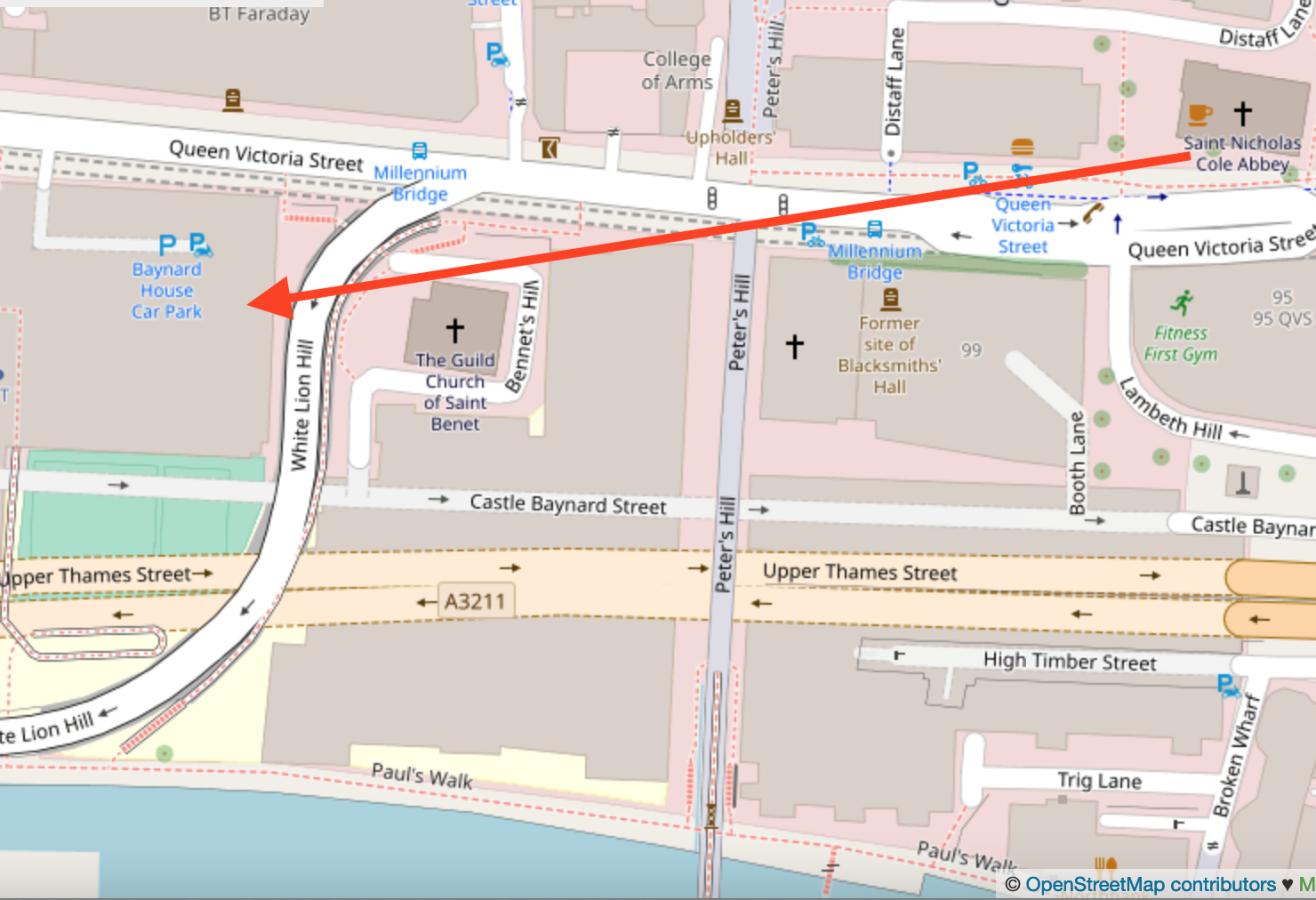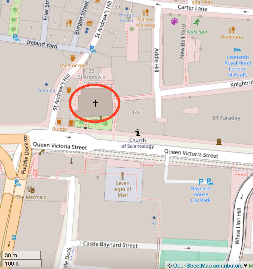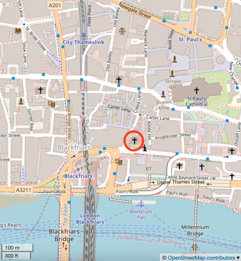 The building in the background is Baynards House, a BT building. In front of the church is the City of London School for Boys. Here are maps: