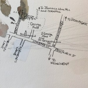 Just off the drawing to the left is 2 George Yard and 20 Gracechurch Street, a modern building, where a long list of companies are registered with financial sounding names: “The Close Investment 1988 Fund “A” “, “The Greater Mekong Capital Fund”. This is the City of London, with all its contrasts and juxtapositions.