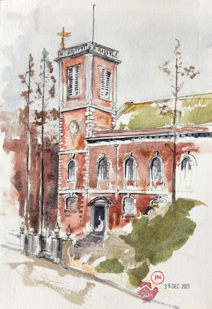St Leonard’s, Shoreditch Church sketched 23 November 2023, 12″ x 9″ [sold]