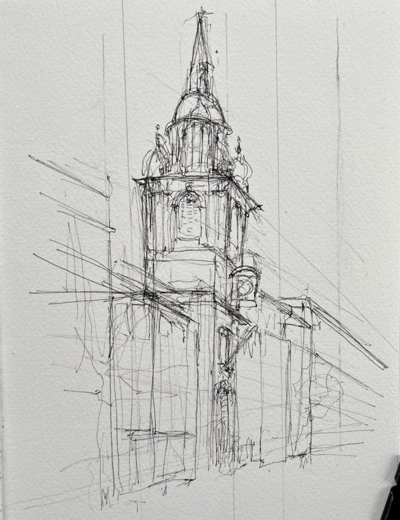 This picture was a commission. My client was keen to have this upward view showing the front of the church. I did some practice sketches to understand the tricky upward perspective.