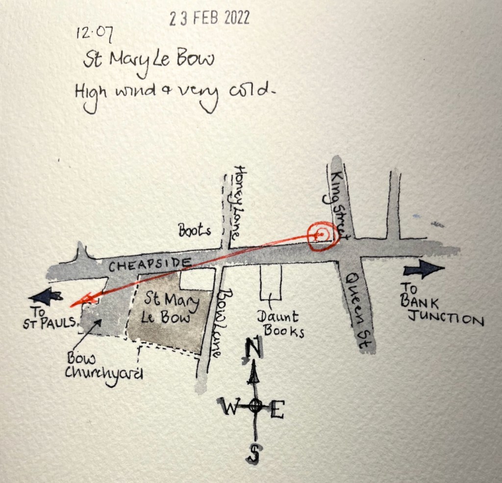 St Mary Le Bow, from Cheapside 23 Feb 2022 10″ x 7″ in Sketchbook 11