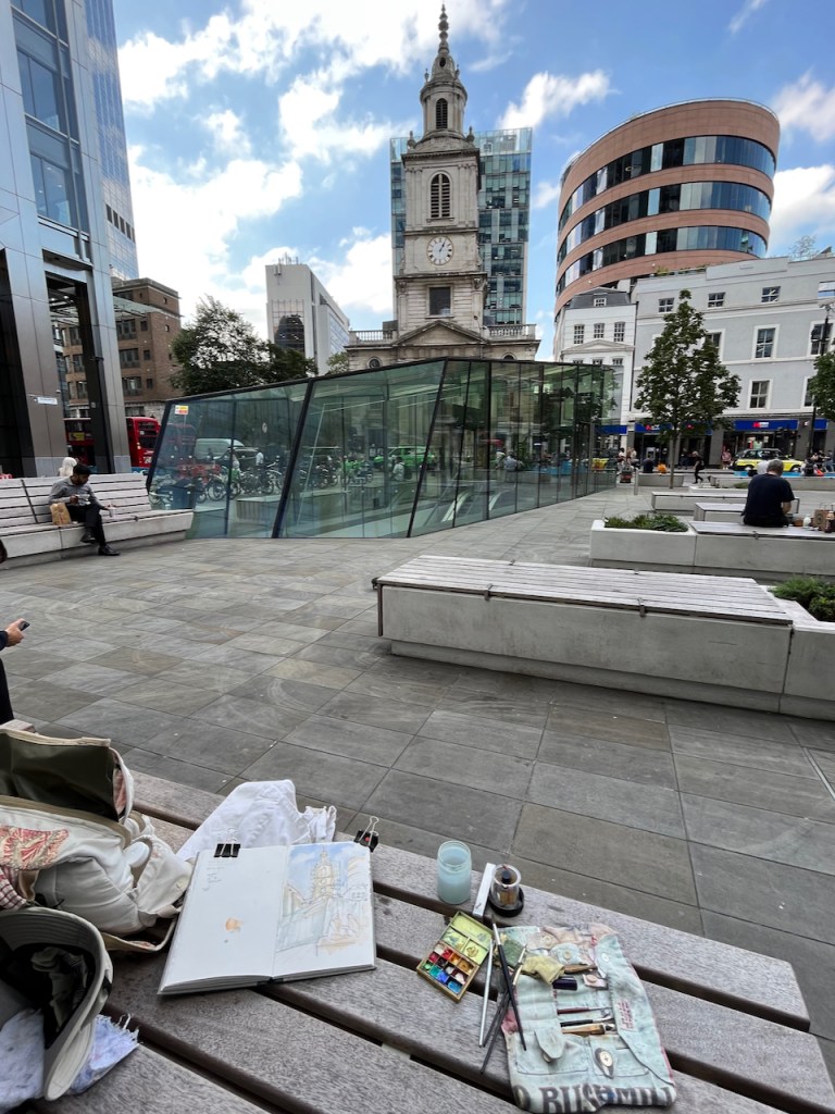 On a lovely sunny morning I walked to the Wren café for breakfast. The Wren is in Saint Nicholas Cole Abbey church on Queen Victoria Street. There is a terrace high above Queen Victoria Street. It commands an excellent view of St Paul’s Cathedral, but I chose to look along the busy road and sketch the Guild Church of St Benets.