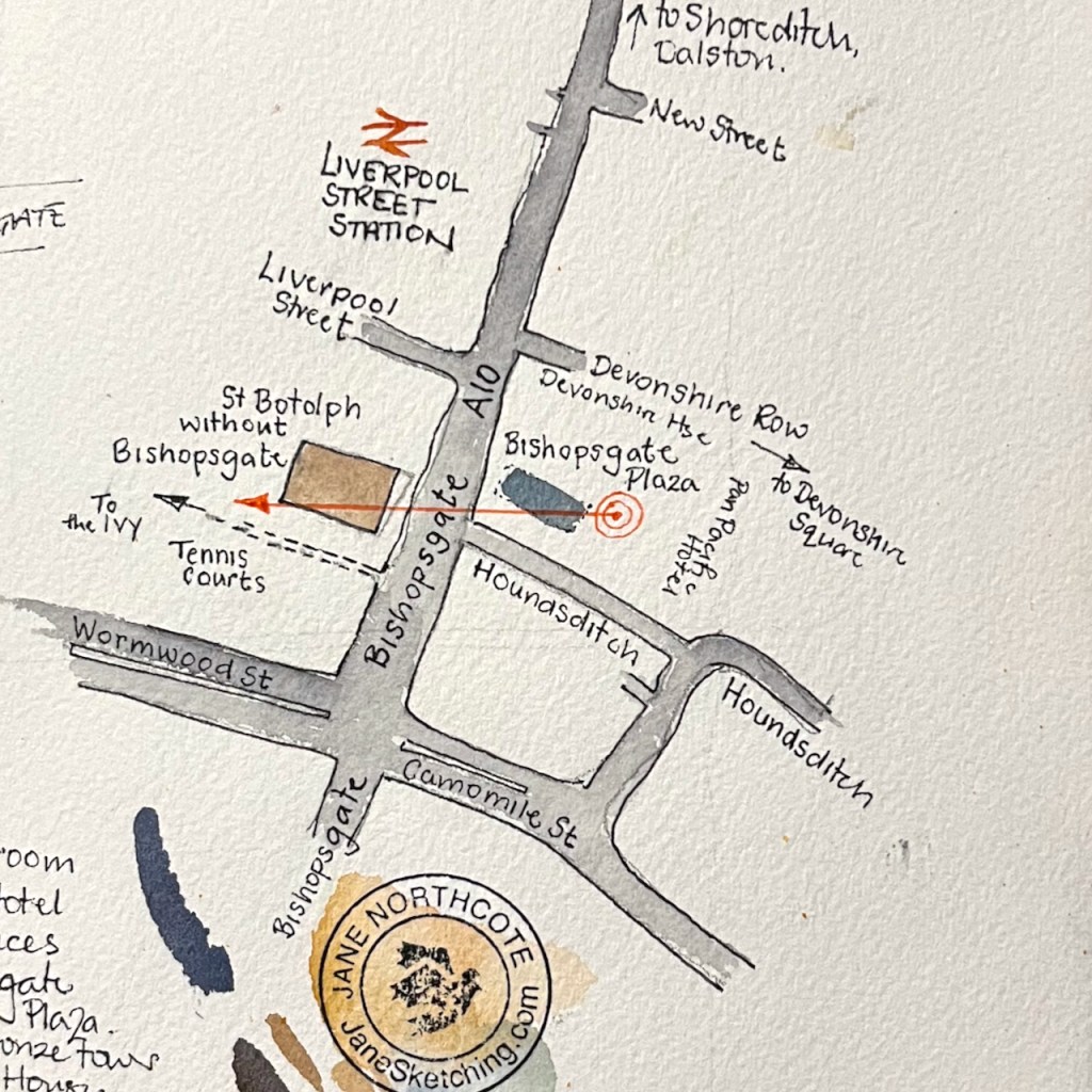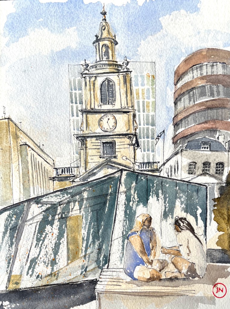 Bishopsgate Plaza is on the East side of Bishopsgate, near Liverpool Street. From the seats there, here is the view of St Botolph-without-Bishopsgate. I sketched amongst the many people enjoying the sun at lunchtime.