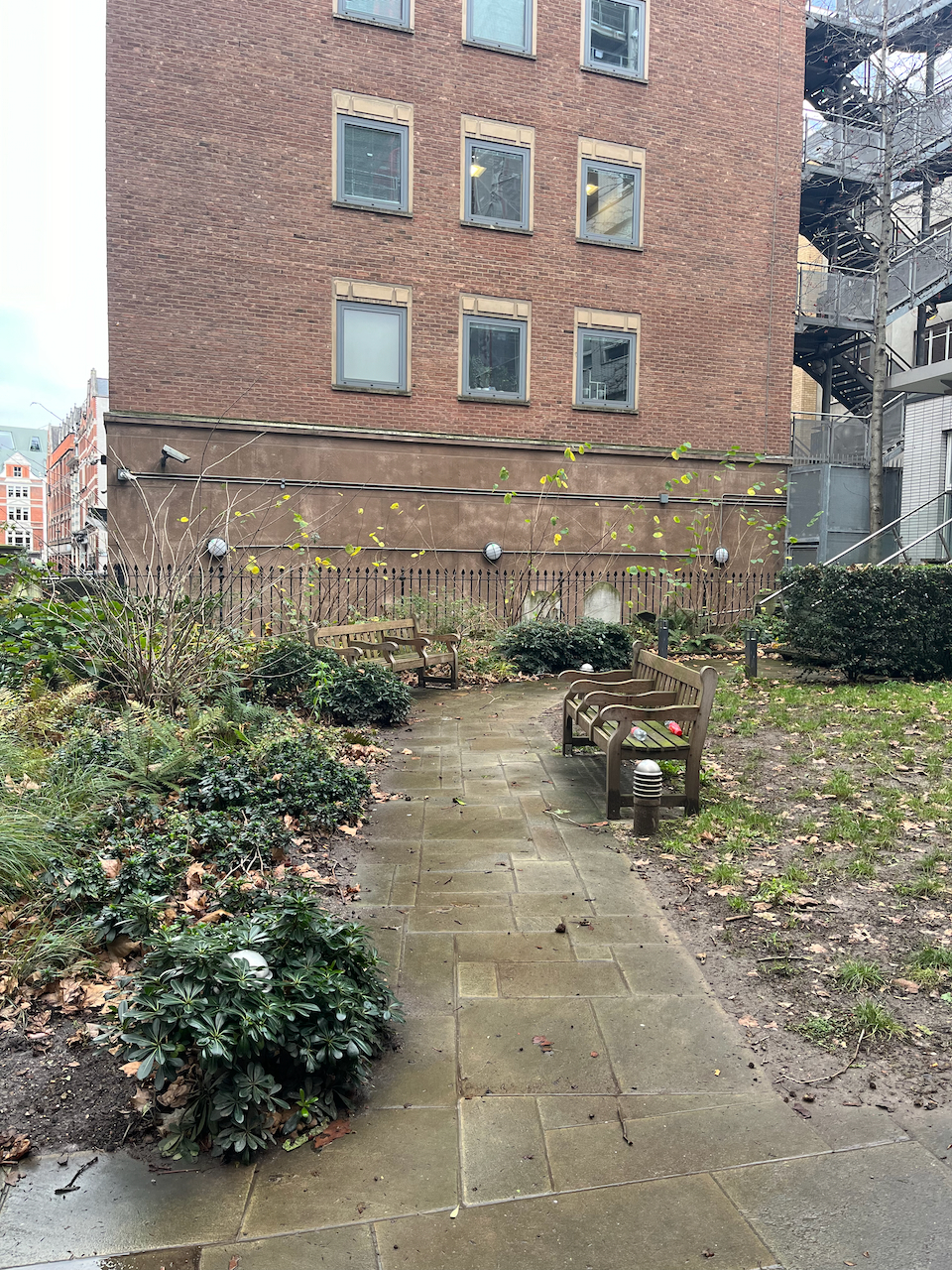 “IanVisits” has an article on the Burial Ground published in 2020. When he visited it was clearly in a better condition than it is now. On my visit, December 2023, the burial ground was litter-strewn and neglected, overshadowed by a building site to the East, and defiled by plastic advertising hoardings flapping on its north fence.