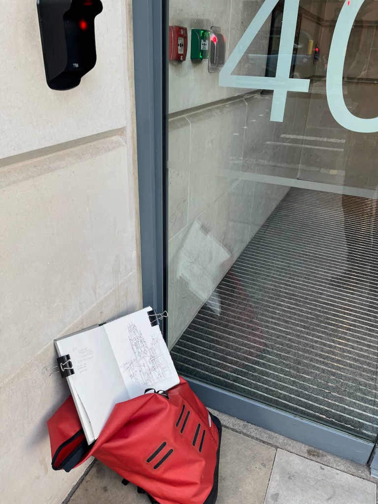 Yesterday, London was quiet. I sketched the church from podium level on Baynard House on the other side of the road. Baynard House is a 1970s office block currently occupied by BT (British Telecommunications, as was). Next to St Andrews on the East is the Church of Scientology. On the West side of St Andrews is a cocktail bar, Rudds.