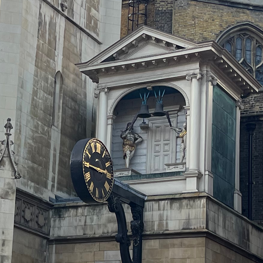 Then there are the clocks. There are two clocks on the tower, both showing the correct time. And there is another clock, also showing the correct time, suspended on a substantial wooden bracket below a little covered stage. Inside the stage are two muscular wooden figures, and two bells. The figures strike the bells every quarter hour. The little stage is described as an “aedicule” in Pevsner, who tells me that the clock was made in 1671.
