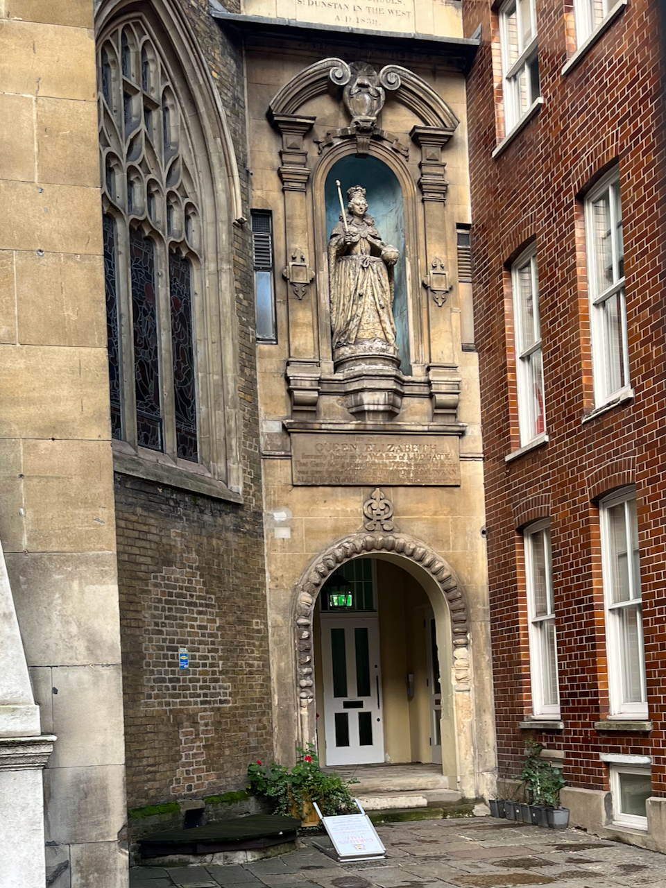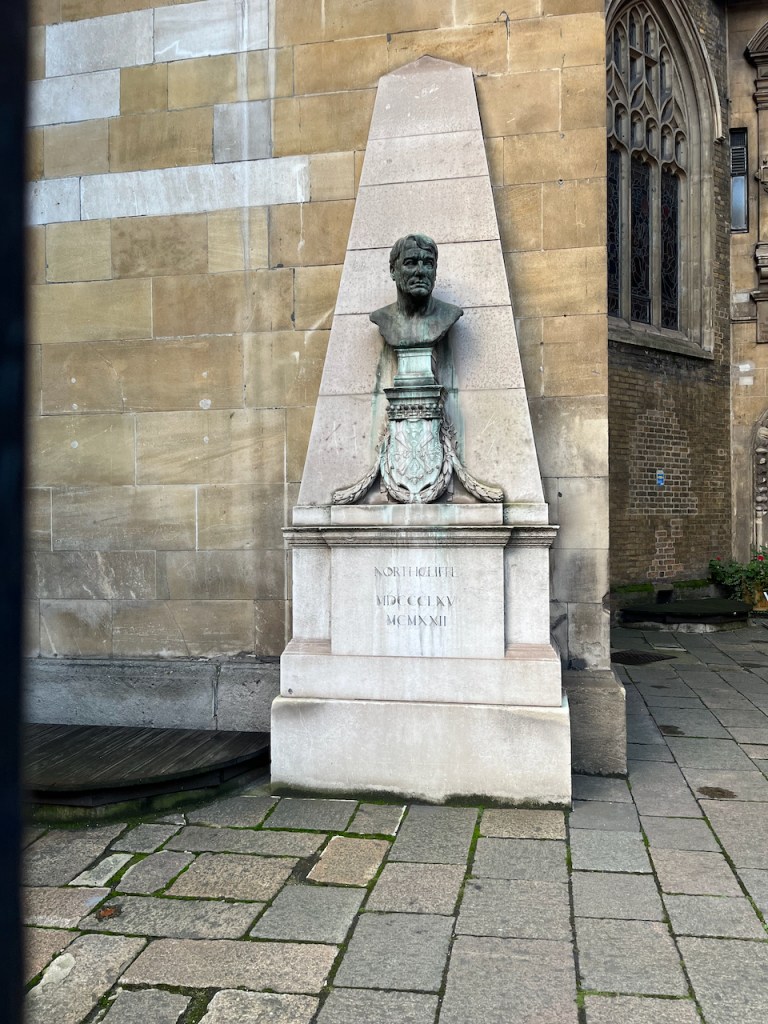 At ground level there is a rather austere monument: the bust of a man, on a plain triangular plinth, labelled simply “Northcliffe MDCCCLXV MCMXXII”. And behind that, above a door, a dusty statue, evidently very old, of Queen Elizabeth the First.