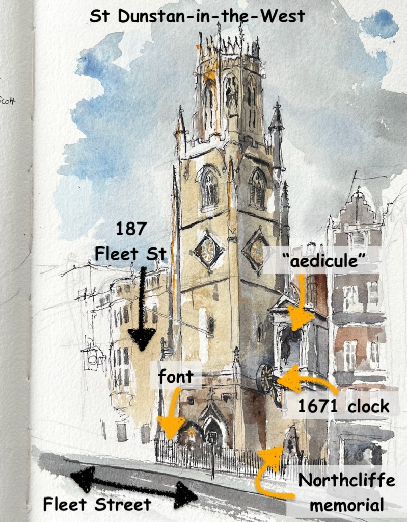St Dunstan-in-the-West, 186a Fleet Street, sketched 31 Dec 2023, in Sketchbook 14