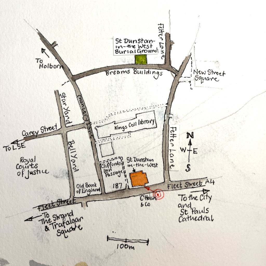 I sketched the church standing on the other side of Fleet Street, near the office of C Hoare and Co, bankers. The church was closed when I visited, but I shall certainly go back and have a look inside during its opening hours.