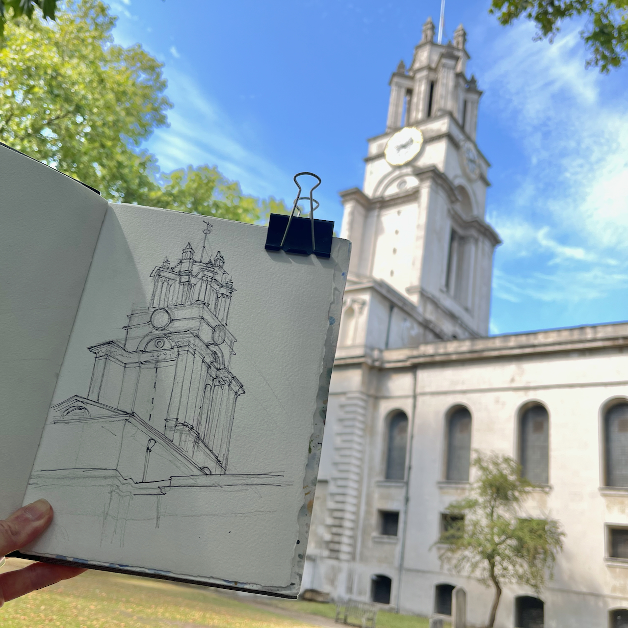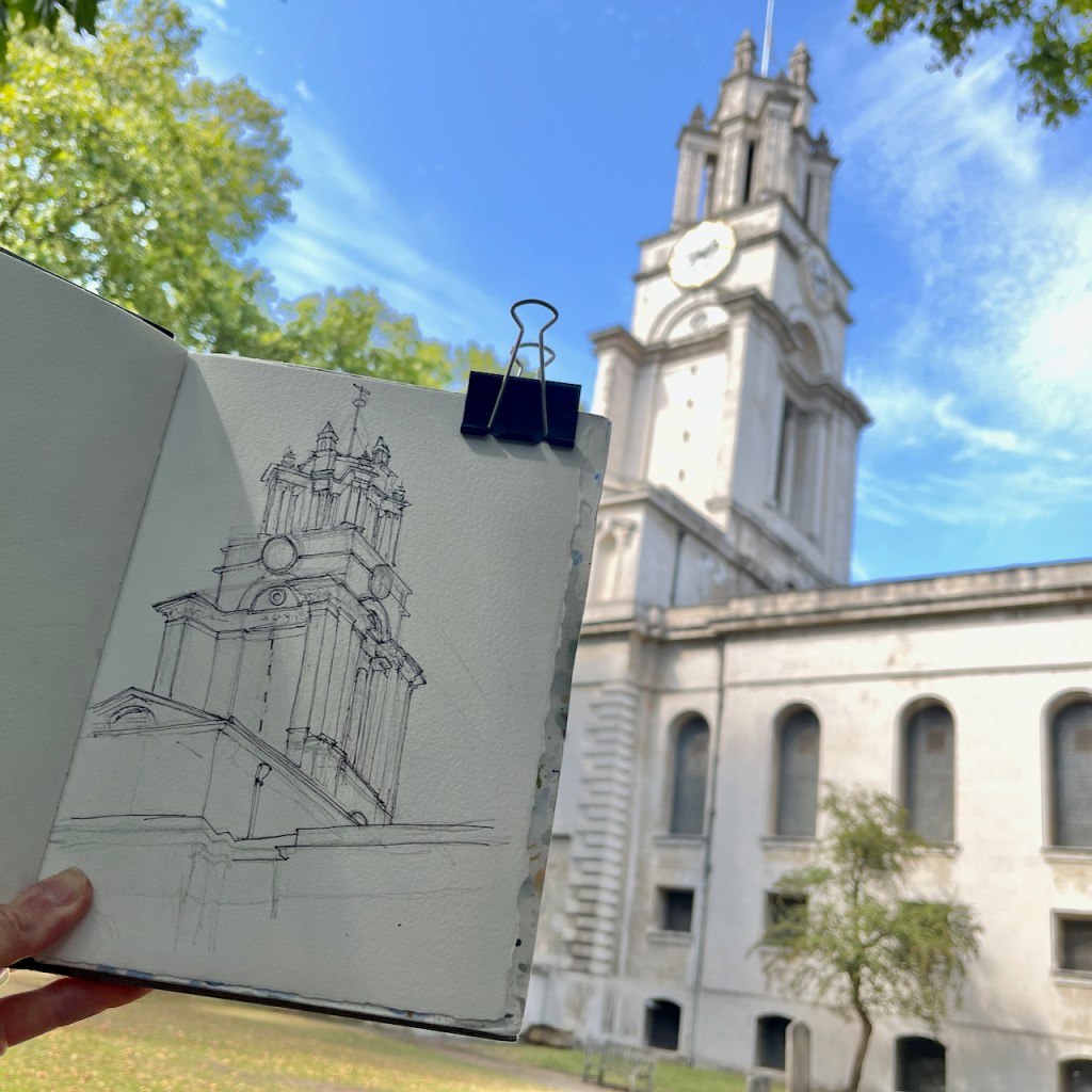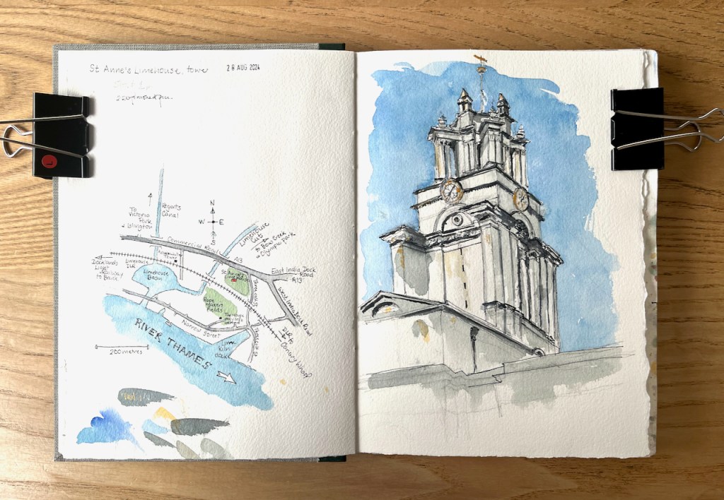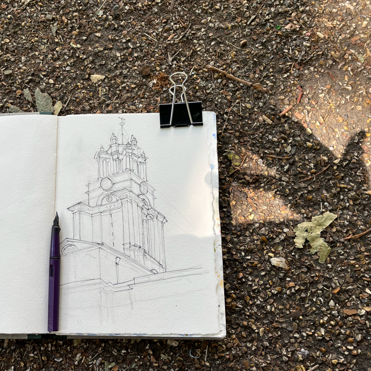 St Anne’s Church Limehouse tower, sketched 28 August 2024 in sketchbook 15