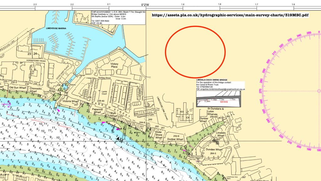 The golden ball is clearly visible on the flagpole, the “sea mark” mentioned in articles about the church. I had a look to see if I could find St Anne’s on a navigational chart. The Port of London Authority offers navigational maps of the Thames – but sadly St Anne’s is not shown as a “sea mark” on any of them.