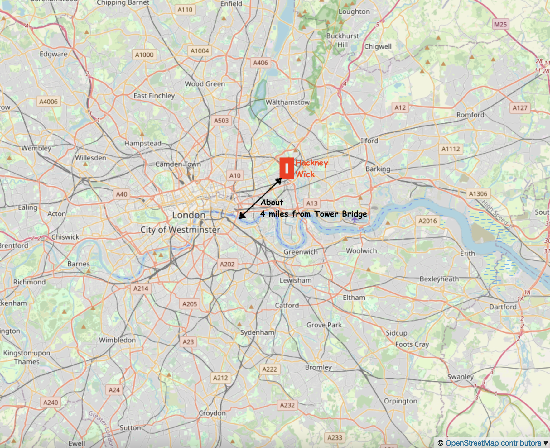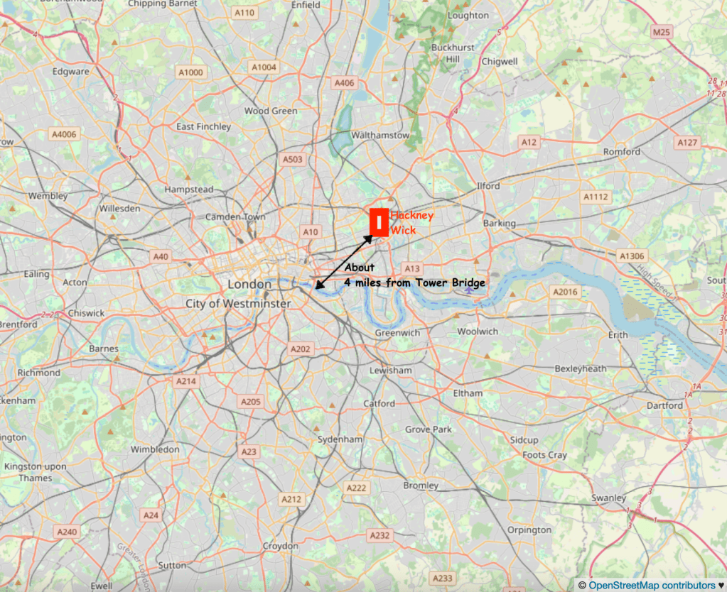 Hackney Wick is on the East side of London, 20 min walk from the Stratford railway station, and on the Hackney Wick overground.Hackney Wick is between the Olympic Park and Victoria Park.