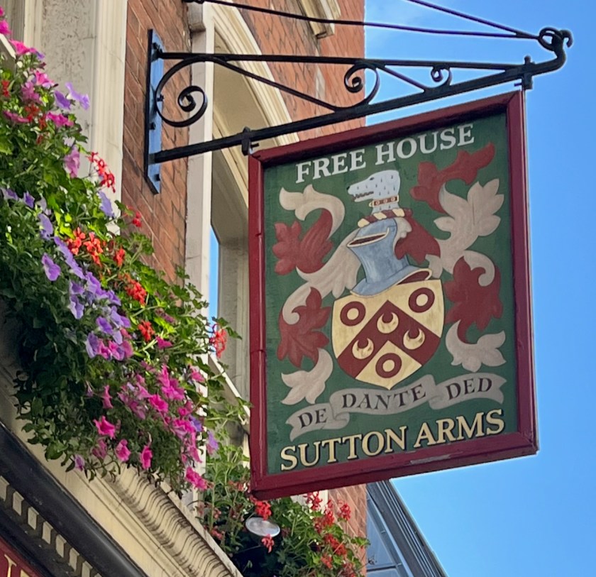 The pub sign is Sutton’s coat of arms. His motto is: