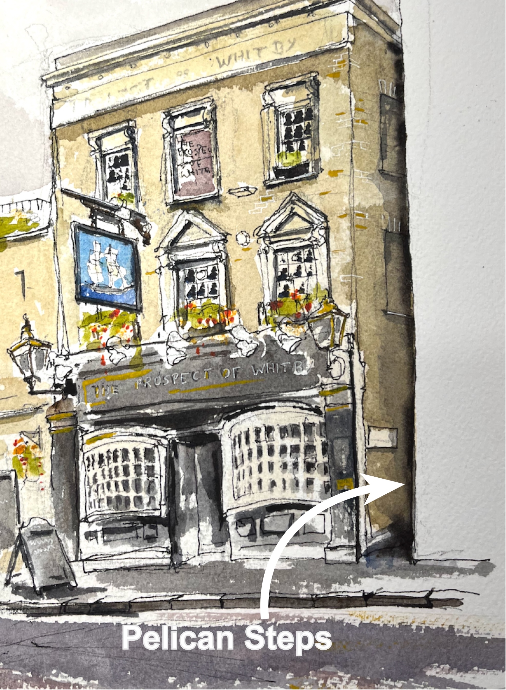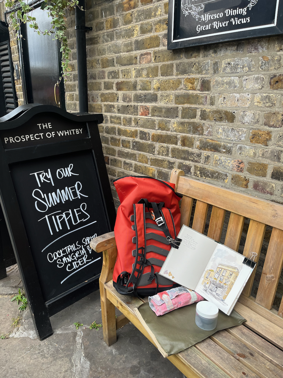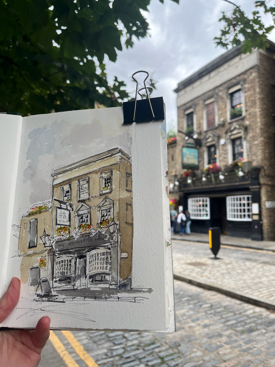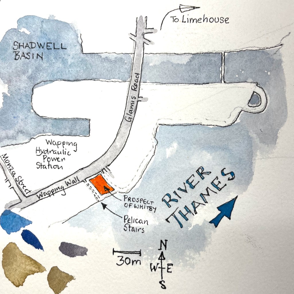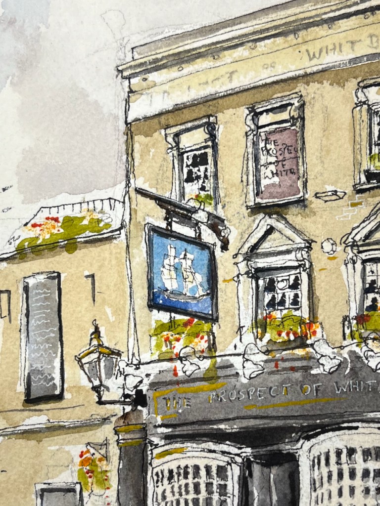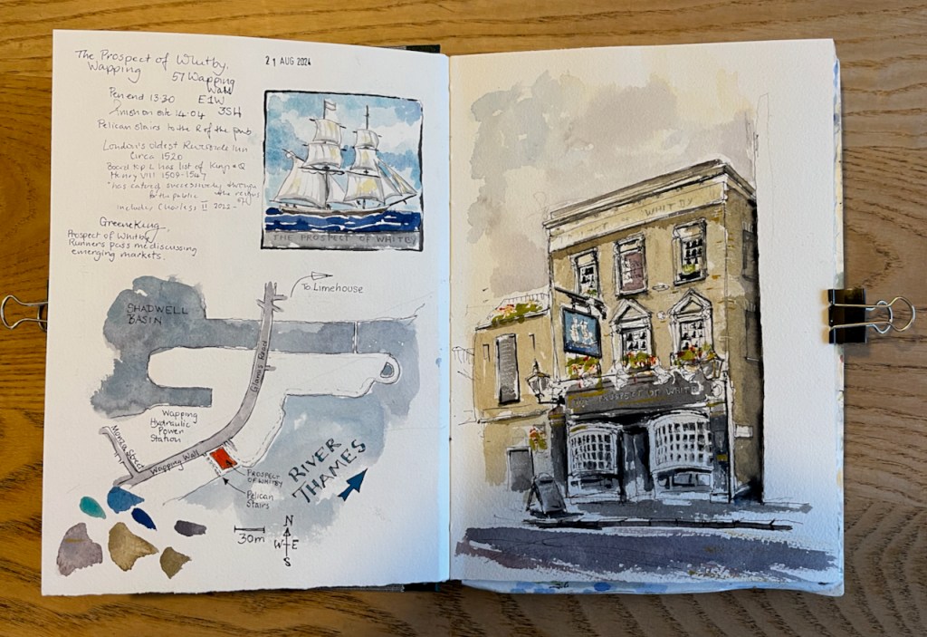 “The Prospect of Whitby” sketched 21 August 2024 at 2pm, the first picture in Sketchbook 15