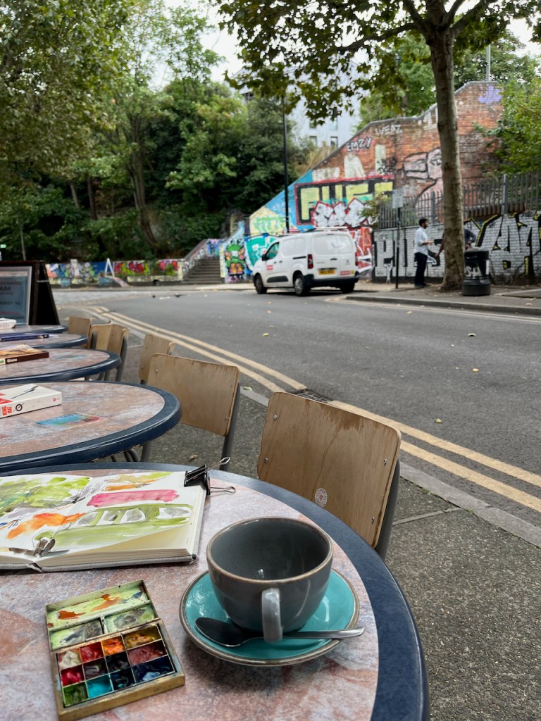 Market Café, Broadway Market, Hackney E8, sketched 12 November 2024, 12″ x 9″ [sold]