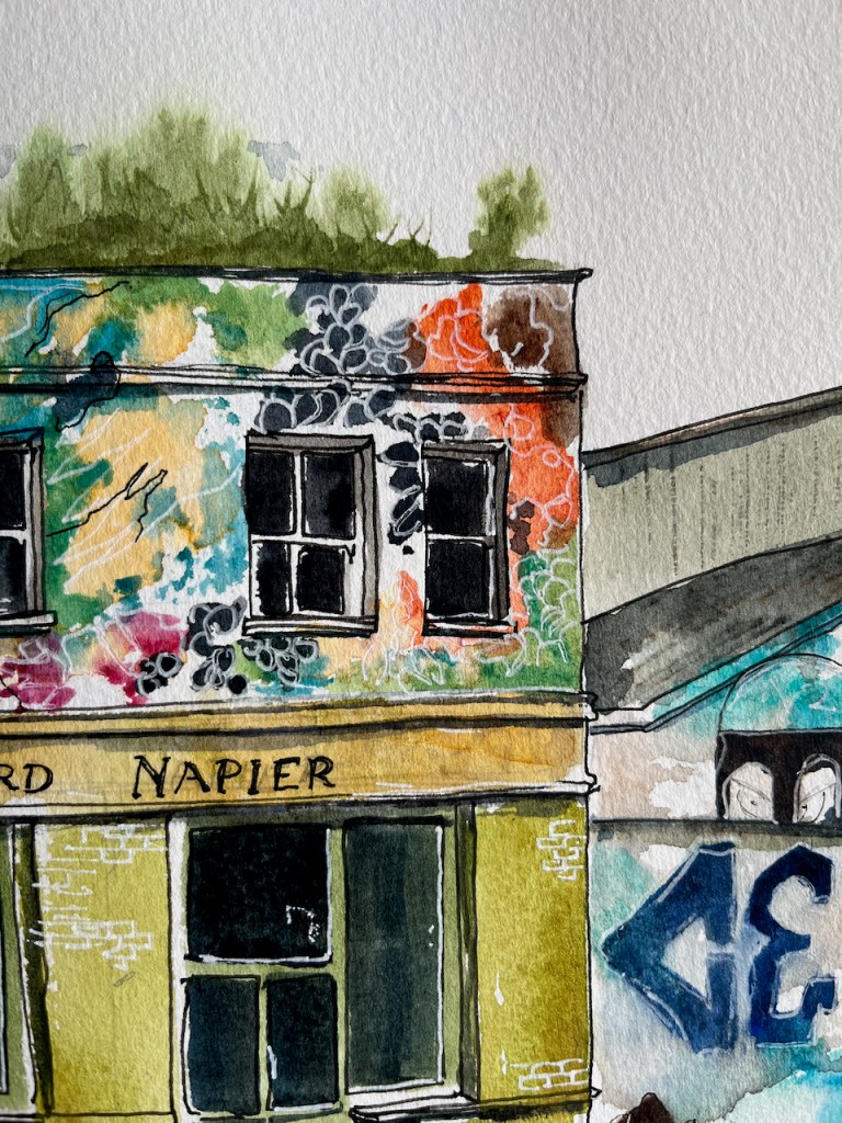 As you see, the top of the pub is covered in street art. I had fun trying to copy it. The original art is done at large scale with a spray can. My drawing is at small scale with watercolour and gel pens.