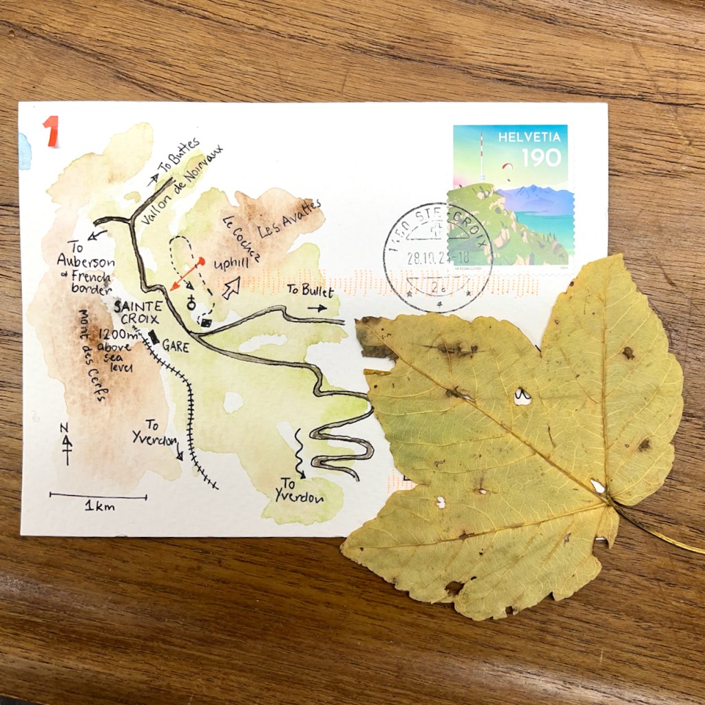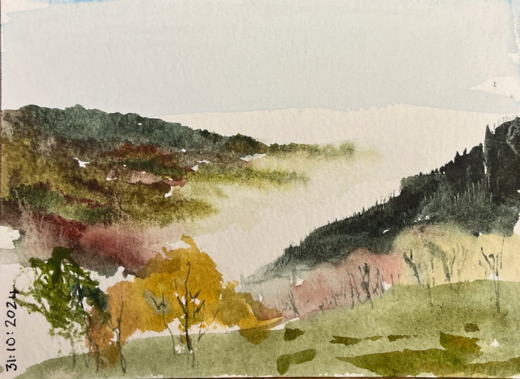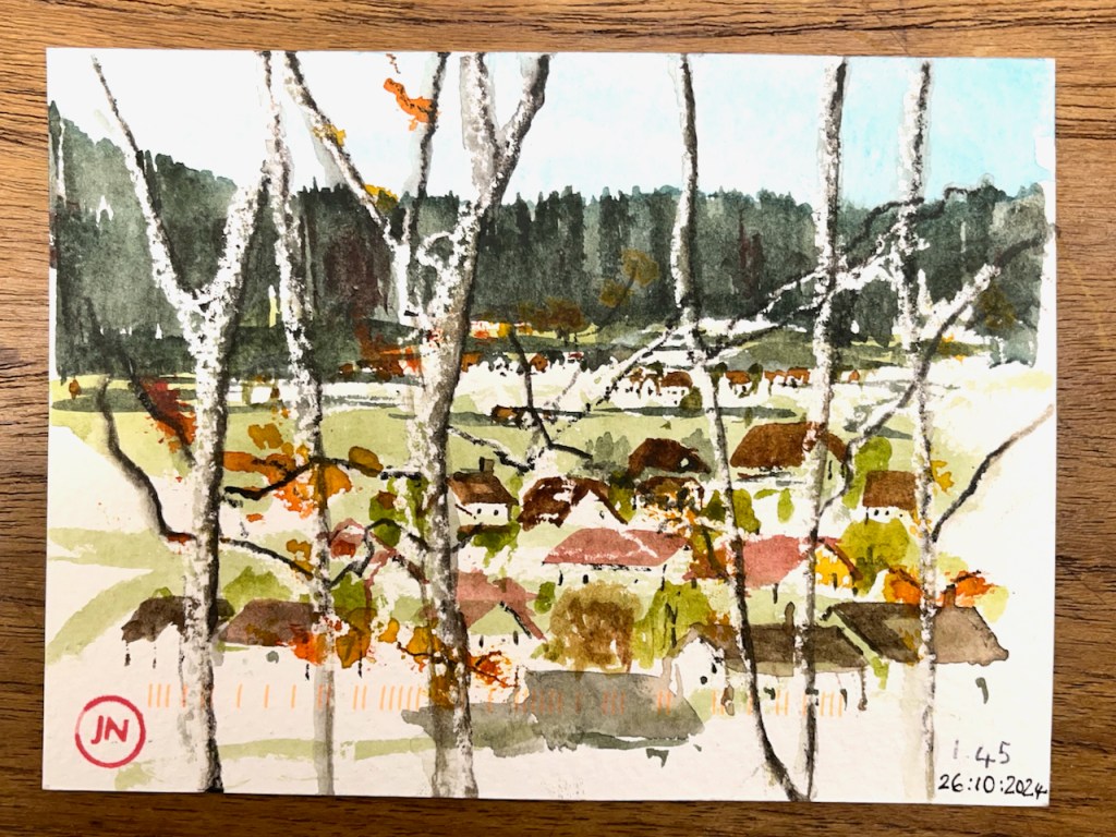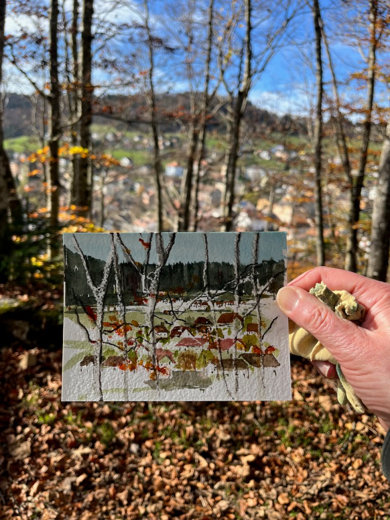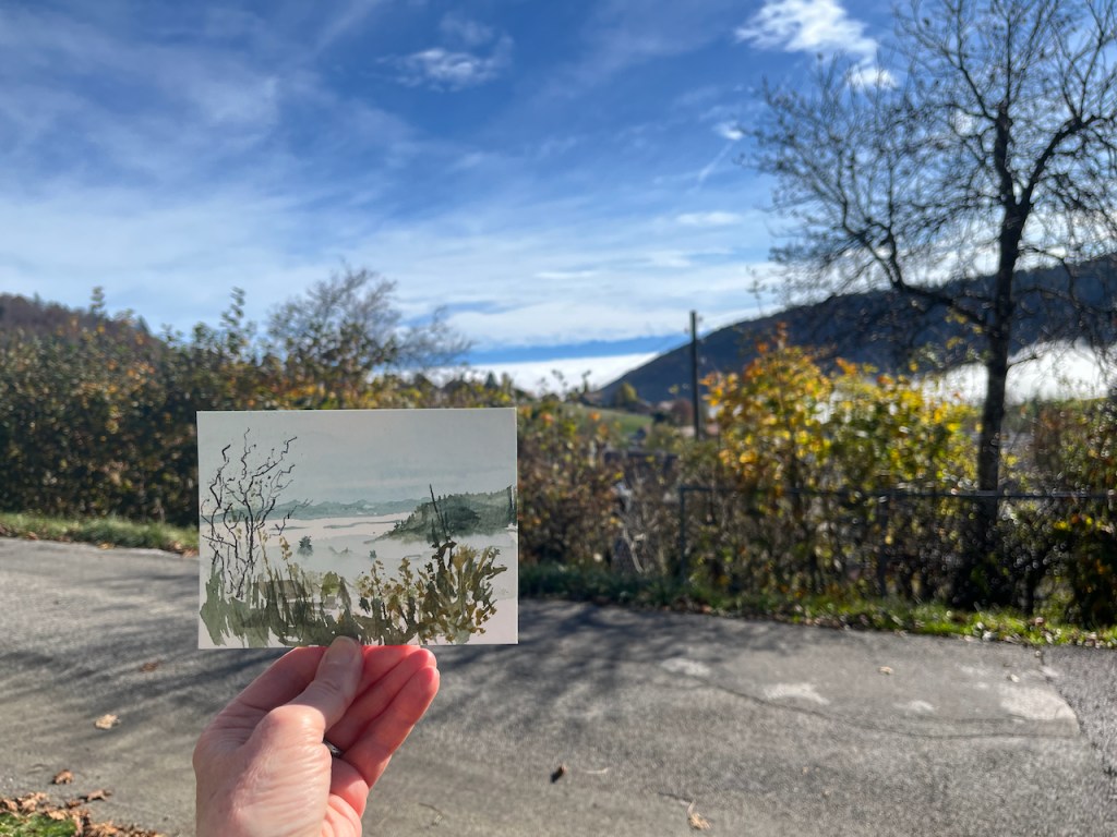 One day, starting early, my hosts dropped me in the village of Vuiteboeuf, which is at the lower end of the Gorges de Covatannaz. I walked up, through the fog. It took about an hour and a half. I’d intended to sketch and I had my watercolours with me. But the fog made it surprisingly cold, and I didn’t want to stop or I would freeze. I was warm so long as I kept walking. So I made very quick sketches using Derwent “inktense” watercolour pencils. Here are my sketches in video format.