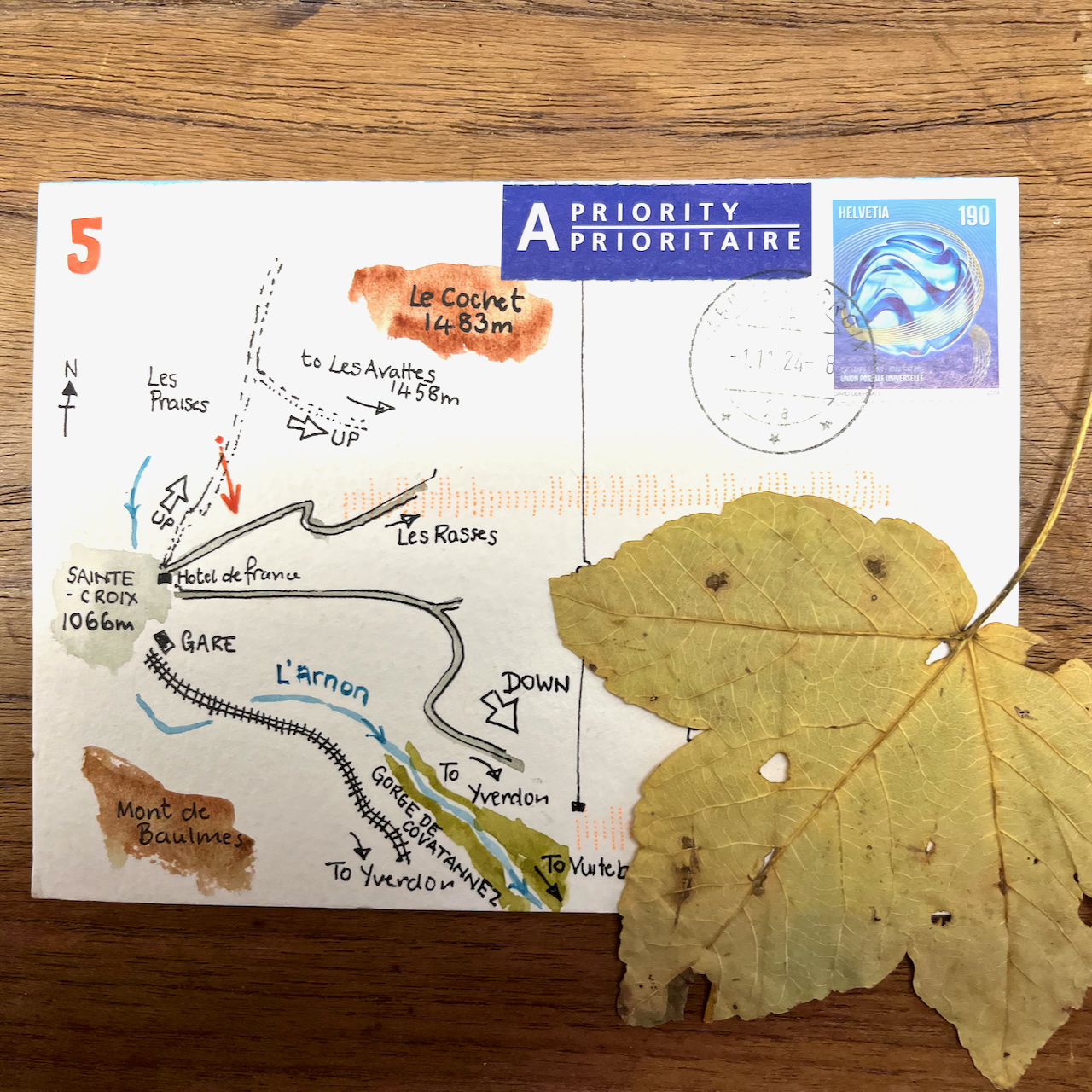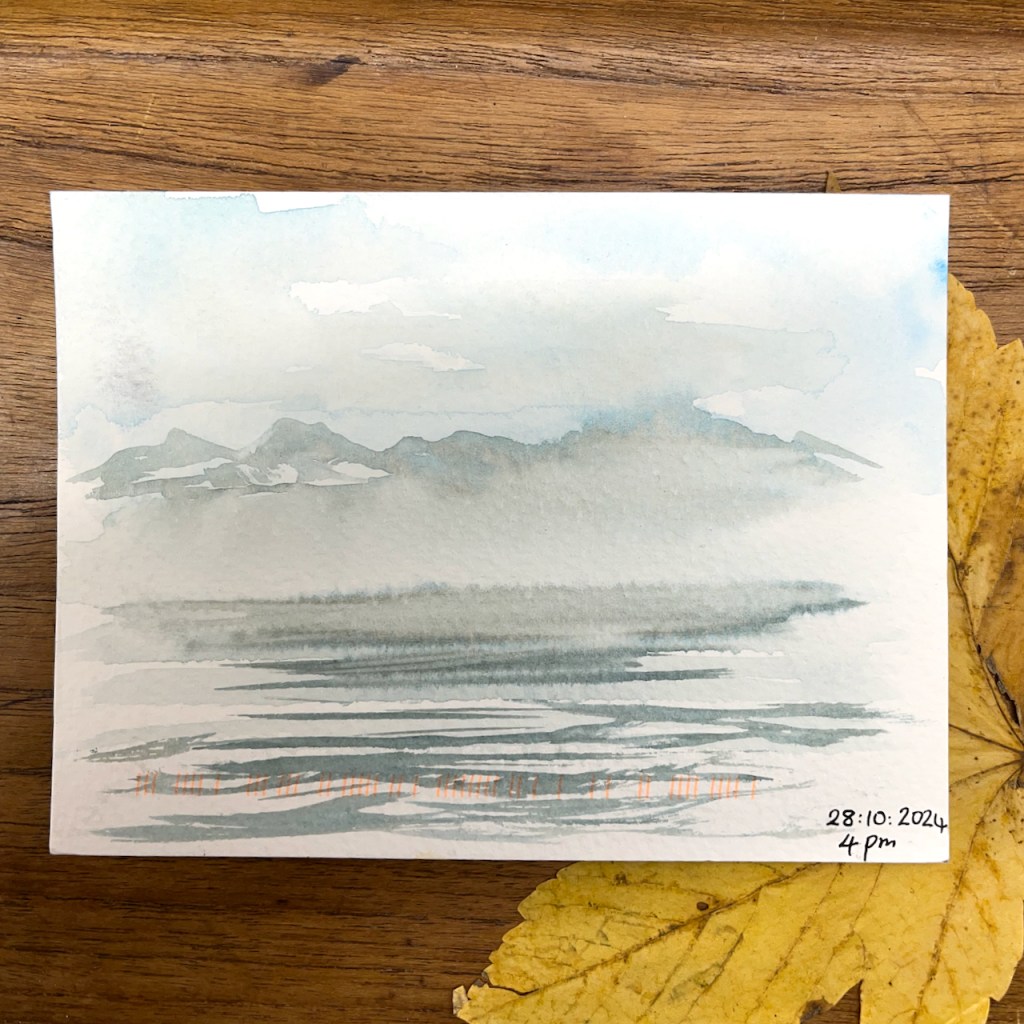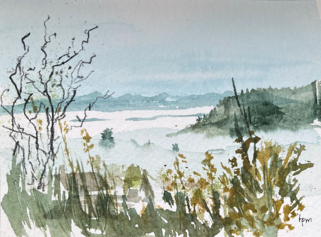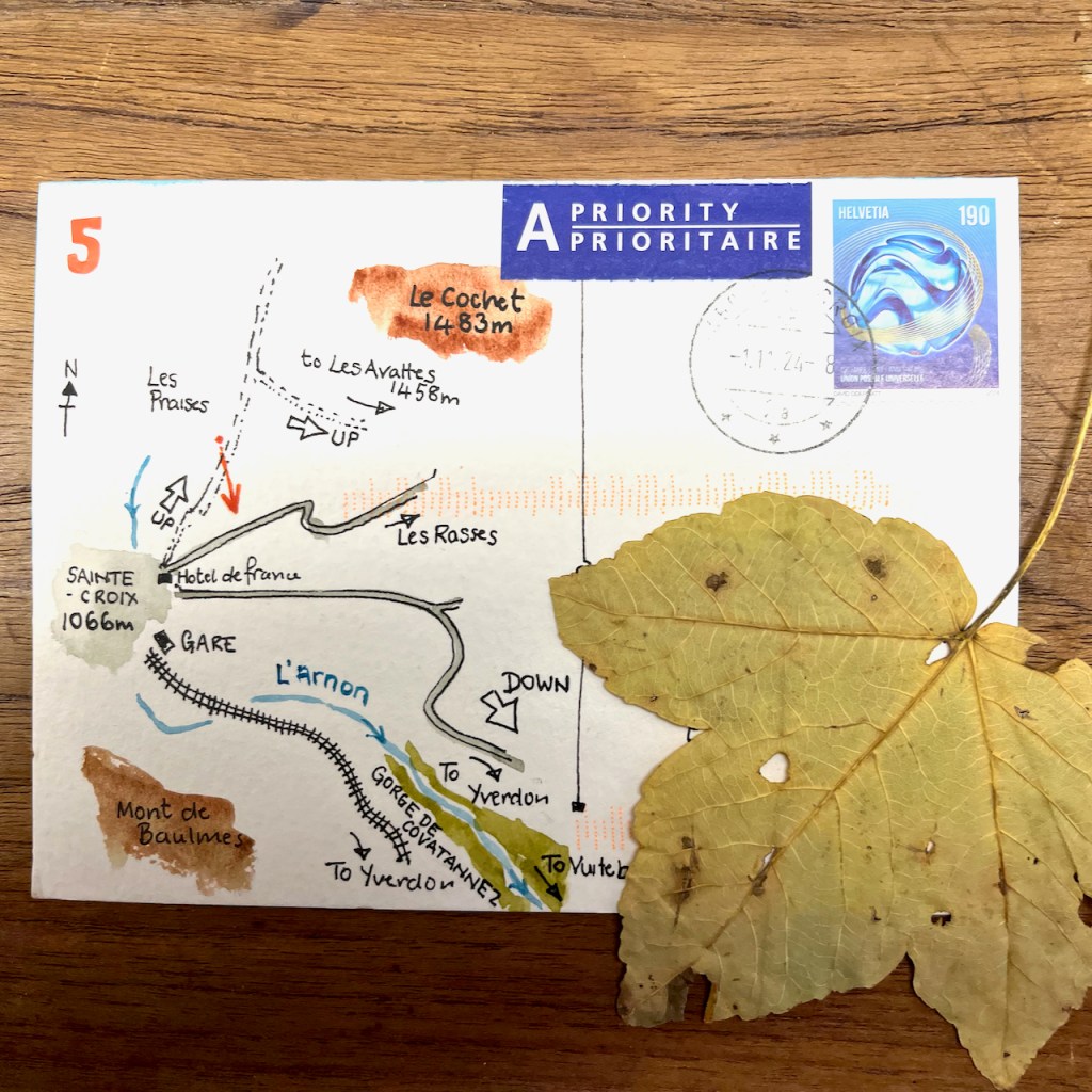 One day, starting early, my hosts dropped me in the village of Vuiteboeuf, which is at the lower end of the Gorges de Covatannaz. I walked up, through the fog. It took about an hour and a half. I’d intended to sketch and I had my watercolours with me. But the fog made it surprisingly cold, and I didn’t want to stop or I would freeze. I was warm so long as I kept walking. So I made very quick sketches using Derwent “inktense” watercolour pencils. Here are my sketches in video format.