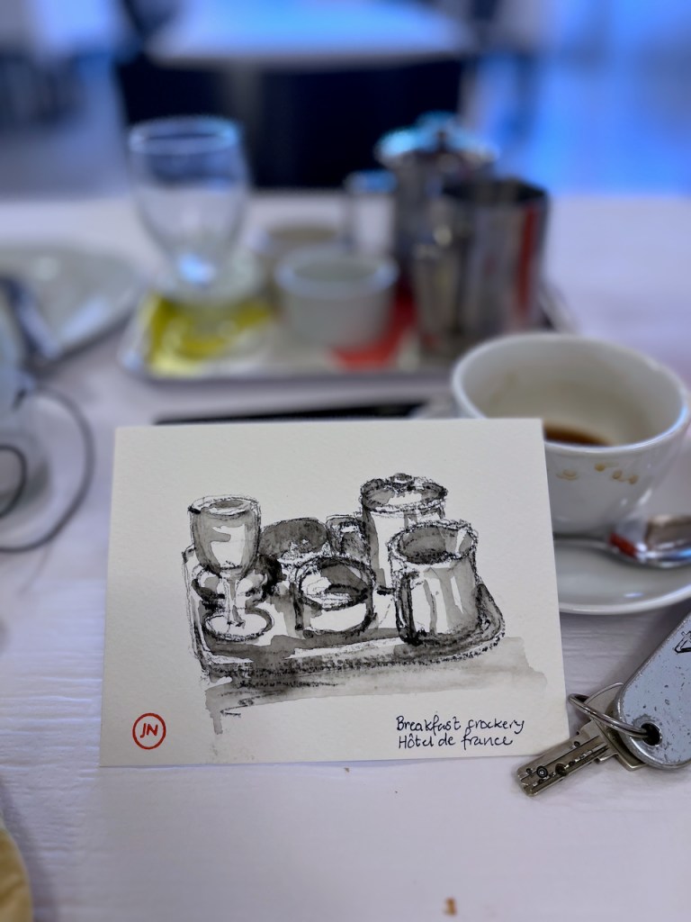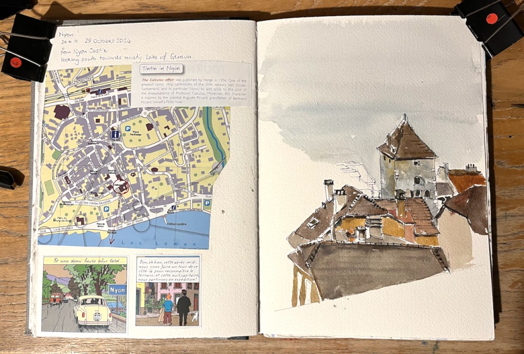 My visit took me to Nyon, on the shores of Lake Geneva. I made a quick sketch from the walls of the castle. Did you know that the Tintin story, “The Calculus Affair” was set in Nyon? The tourist office made much of this connection.