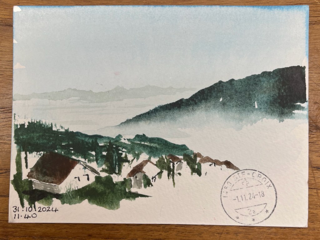 A walk above the villageLooking across Lake Geneva from MorgesFrom Les Praises, looking across to the Alps The Alps above the fogSketching in Sainte-Croix, Vaud (1000m)