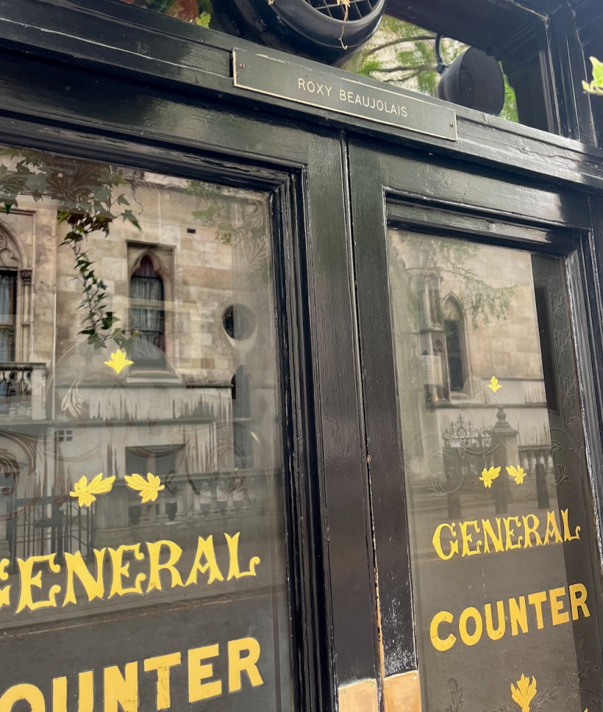 “This tranquil little pub now faces the back of the Royal Courts of Justice, the esteemed Gothic Revival building opened by Queen Victoria in 1882. Within The Seven Stars’ ancient charm of three narrow rooms that make up its public area, drinking in Queer Street (as Carey Street has often been called because of the bankruptcy courts) is contrarily pleasant. One can linger over gastronomic pub food and real ales behind Irish linen lace curtains that are being twitched by litigants, barristers, reporters, LSE students, church musicians, and West End show brass sections. Then, one might navigate to the lavatories up the comically narrow Elizabethan stairs. There are antique Cabinets of Curiosity in the pub’s front windows, and alongside Spy prints of former judges, there are posters of “Brothers in Law,” “A Pair of Briefs,” and other bygone British legal films.”
