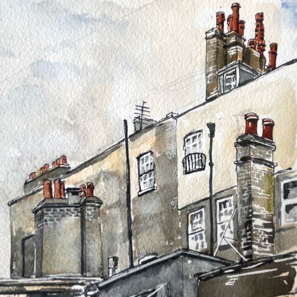Sketching the pub, I enjoyed the landscape of chimneys. The art of the chimney-maker is not enough noticed. They are unsung sculptors. All those legal offices and chambers behind the Seven Stars must have plenty of fireplaces. Hence the chimneys, here present in great numbers and in extraordinary variety.