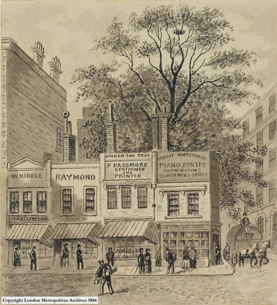 Here’s the same row of shops circa 1870, showing a predecessor of L.R. Wooderson.: Joseph Williams, seller of “pianofortes”, with a warehouse in Berners Street in the West End.