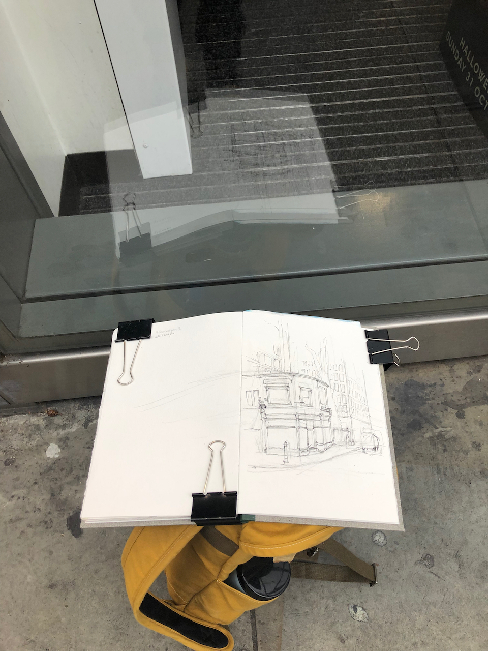 I sketched the building from the corner of the Clerkenwell Road and St John’s Lane. On the other side of the road, I saw a man come and lay out a large flexible chess mat on the stone bench in St John’s Square.