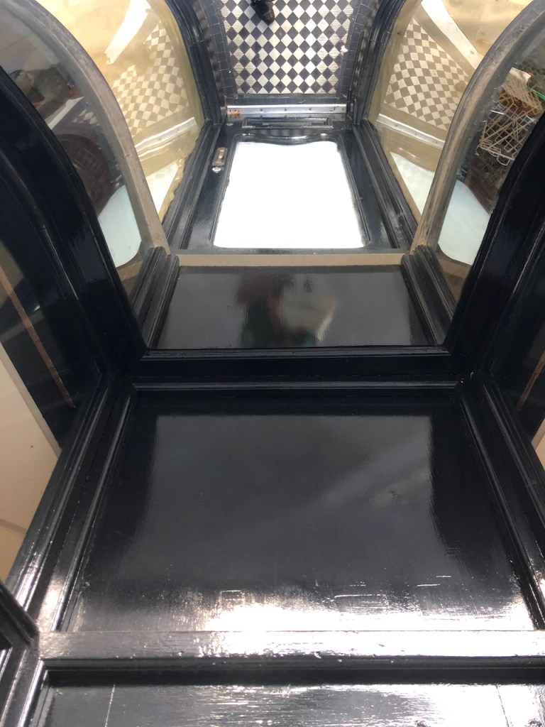 The corner shop is a wonderful little building. I especially admire the curved glass of the two windows either side of the door, which seem to invite you in. Curved glass windows are rare, especially at street level, so these deserve recognition and admiration. Even more amazing is the mirror on the ceiling! If you step between the curved glass windows and look up, you see that this entrance space is reflected in a mirror. Perhaps this was a device so that if needed, you could see your newly purchased shirt or hat from above?